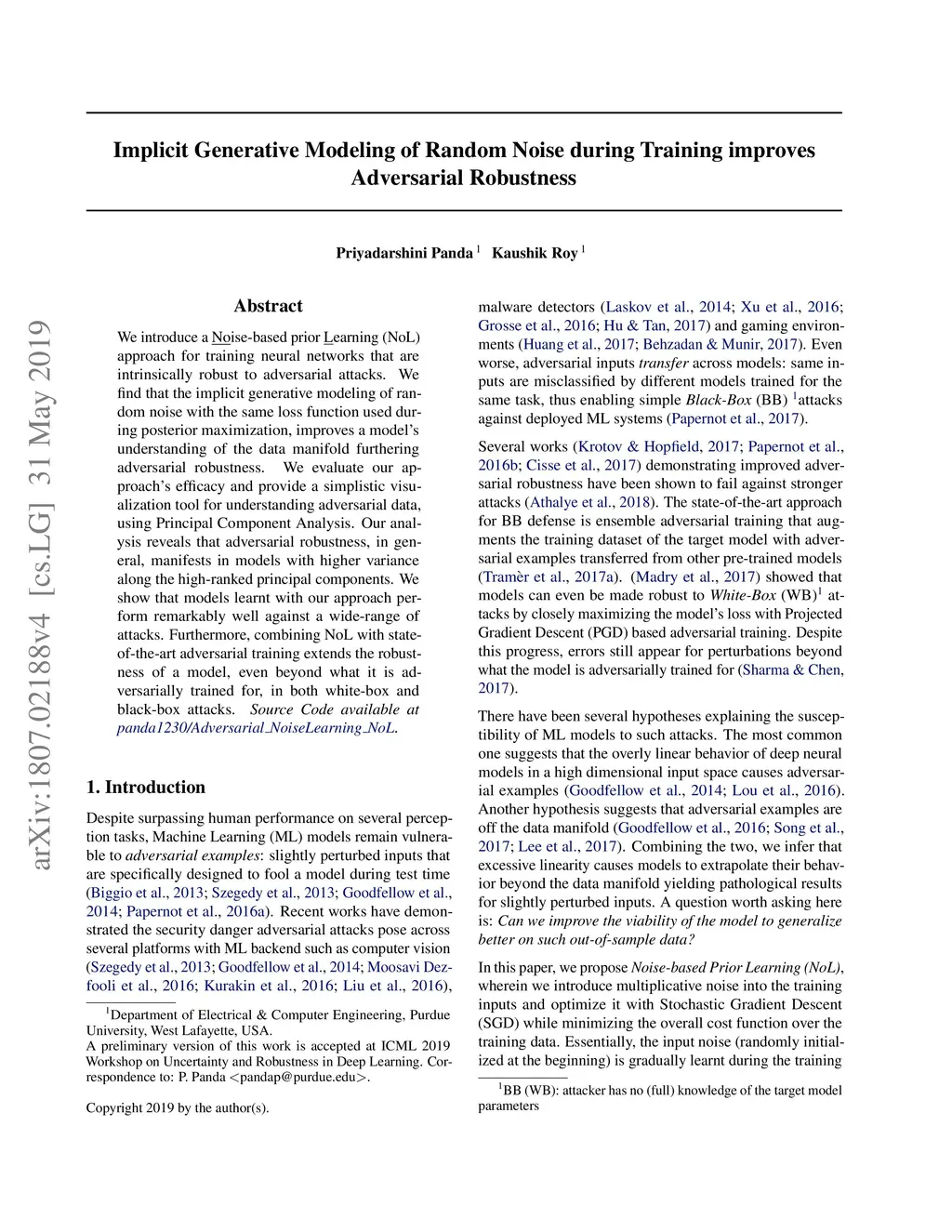 We introduce a Noise-based prior Learning (NoL) approach for training neural networks that are intrinsically robust to adversarial attacks. We find that the implicit generative modeling of random noise with the same loss function used during posterior maximization, improves a model's understanding of the data manifold furthering adversarial robustness. We evaluate our approach's efficacy and provide a simplistic visualization tool for understanding adversarial data, using Principal Component Analysis. Our analysis reveals that adversarial robustness, in general, manifests in models with higher variance along the high-ranked principal components. We show that models learnt with our approach perform remarkably well against a wide-range of attacks. Furthermore, combining NoL with state-of-the-art adversarial training extends the robustness of a model, even beyond what it is adversarially trained for, in both white-box and black-box attack scenarios.