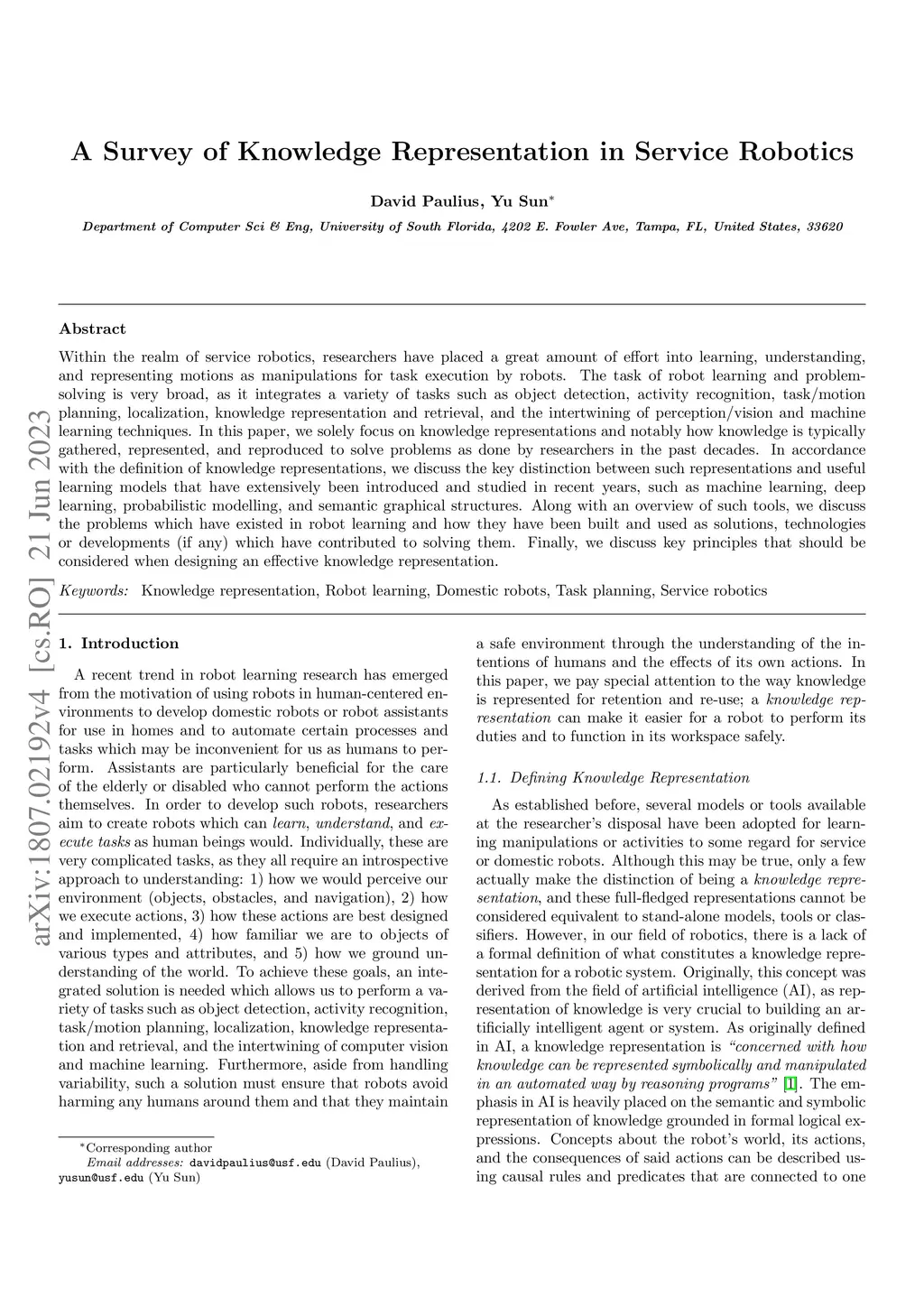 A Survey of Knowledge Representation in Service Robotics