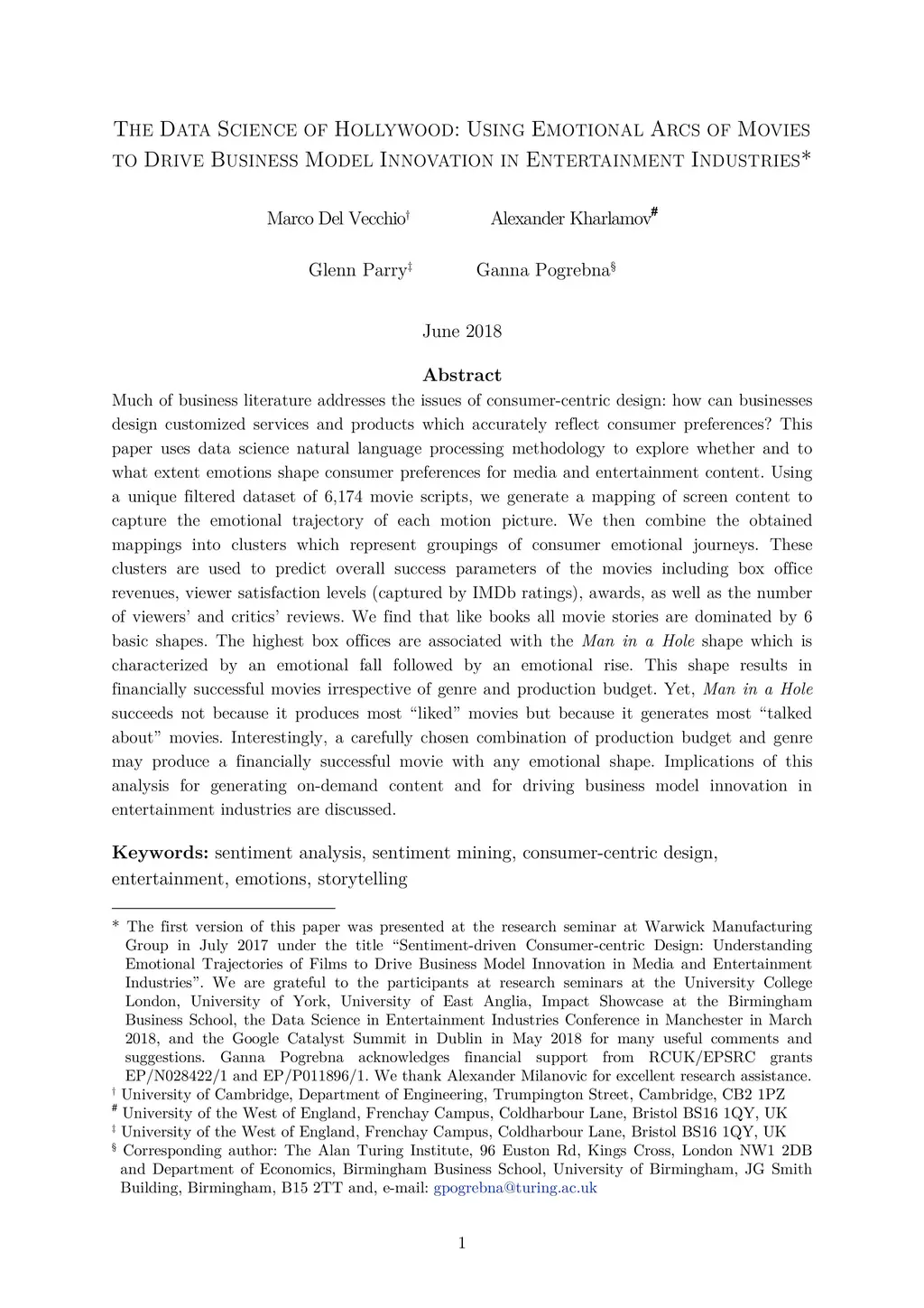 Much of business literature addresses the issues of consumer-centric design: how can businesses design customized services and products which accurately reflect consumer preferences? This paper uses data science natural language processing methodology to explore whether and to what extent emotions shape consumer preferences for media and entertainment content. Using a unique filtered dataset of 6,174 movie scripts, we generate a mapping of screen content to capture the emotional trajectory of each motion picture. We then combine the obtained mappings into clusters which represent groupings of consumer emotional journeys. These clusters are used to predict overall success parameters of the movies including box office revenues, viewer satisfaction levels (captured by IMDb ratings), awards, as well as the number of viewers' and critics' reviews. We find that like books all movie stories are dominated by 6 basic shapes. The highest box offices are associated with the Man in a Hole shape which is characterized by an emotional fall followed by an emotional rise. This shape results in financially successful movies irrespective of genre and production budget. Yet, Man in a Hole succeeds not because it produces most "liked" movies but because it generates most "talked about" movies. Interestingly, a carefully chosen combination of production budget and genre may produce a financially successful movie with any emotional shape. Implications of this analysis for generating on-demand content and for driving business model innovation in entertainment industries are discussed.