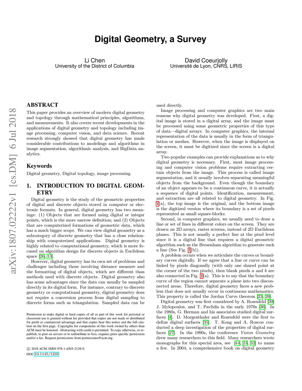 This paper provides an overview of modern digital geometry and topology through mathematical principles, algorithms, and measurements. It also covers recent developments in the applications of digital geometry and topology including image processing, computer vision, and data science. Recent research strongly showed that digital geometry has made considerable contributions to modelings and algorithms in image segmentation, algorithmic analysis, and BigData analytics.