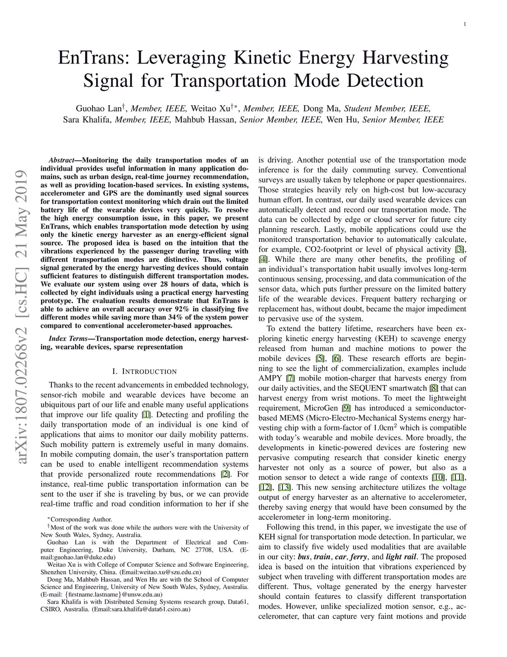 EnTrans:Leveraging Kinetic Energy Harvesting Signal for Transportation