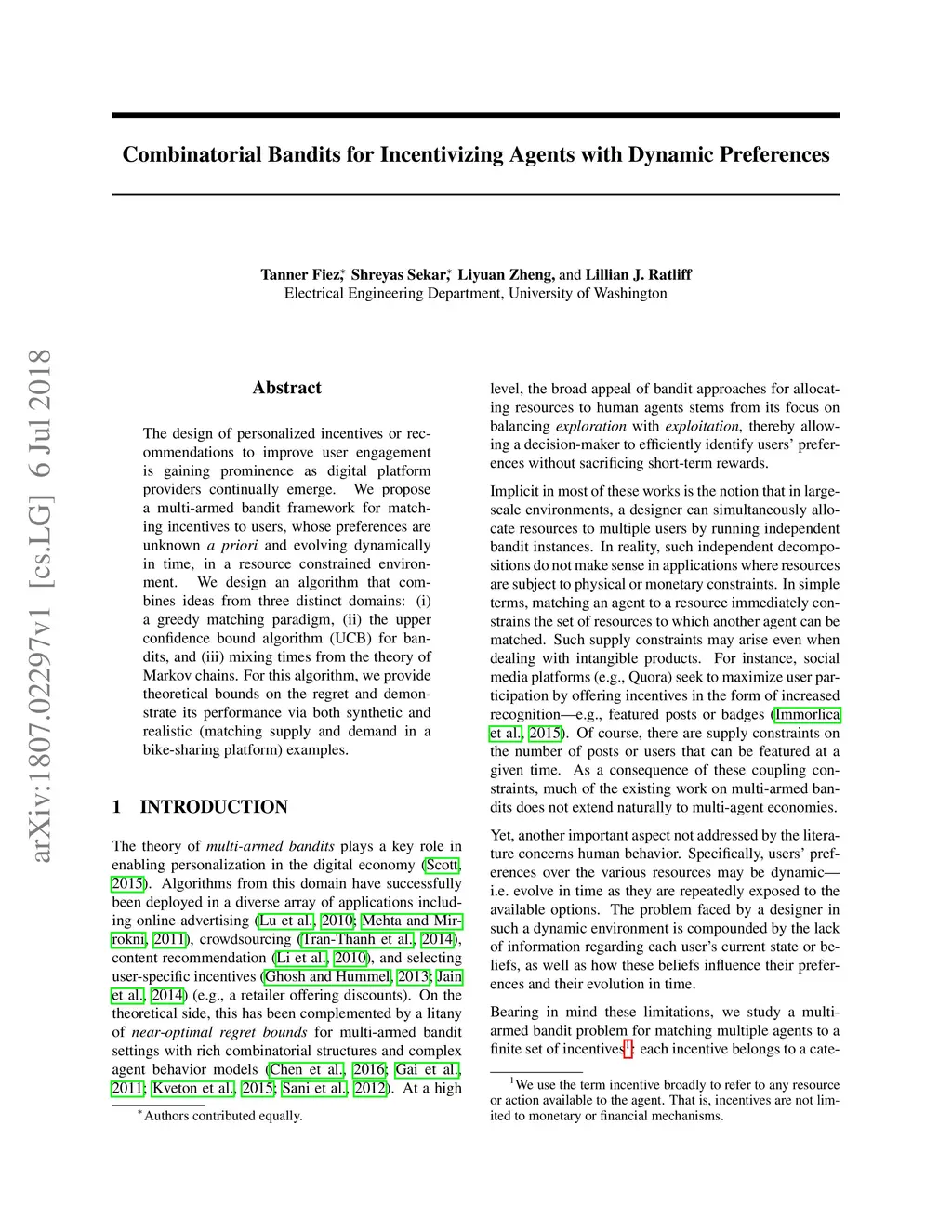 The design of personalized incentives or recommendations to improve user engagement is gaining prominence as digital platform providers continually emerge. We propose a multi-armed bandit framework for matching incentives to users, whose preferences are unknown a priori and evolving dynamically in time, in a resource constrained environment. We design an algorithm that combines ideas from three distinct domains: (i) a greedy matching paradigm, (ii) the upper confidence bound algorithm (UCB) for bandits, and (iii) mixing times from the theory of Markov chains. For this algorithm, we provide theoretical bounds on the regret and demonstrate its performance via both synthetic and realistic (matching supply and demand in a bike-sharing platform) examples.