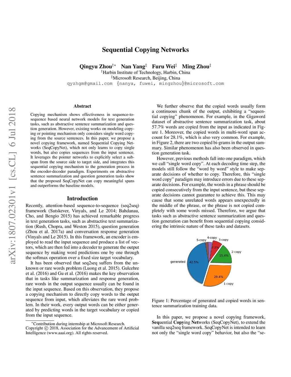 Copying mechanism shows effectiveness in sequence-to-sequence based neural network models for text generation tasks, such as abstractive sentence summarization and question generation. However, existing works on modeling copying or pointing mechanism only considers single word copying from the source sentences. In this paper, we propose a novel copying framework, named Sequential Copying Networks (SeqCopyNet), which not only learns to copy single words, but also copies sequences from the input sentence. It leverages the pointer networks to explicitly select a sub-span from the source side to target side, and integrates this sequential copying mechanism to the generation process in the encoder-decoder paradigm. Experiments on abstractive sentence summarization and question generation tasks show that the proposed SeqCopyNet can copy meaningful spans and outperforms the baseline models.