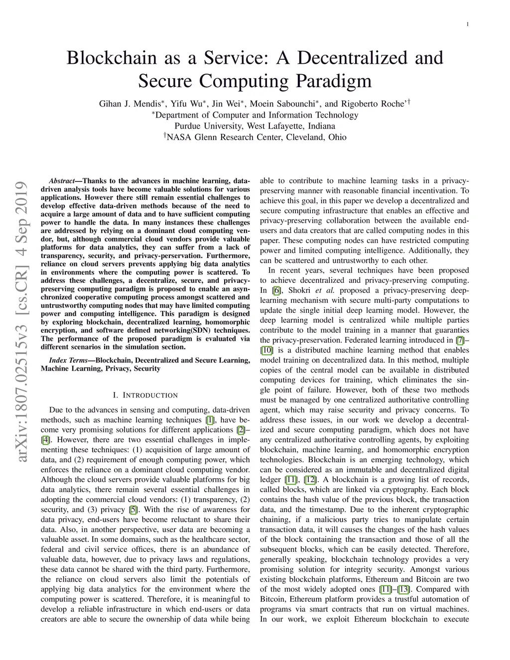 Thanks to the advances in machine learning, data-driven analysis tools have become valuable solutions for various applications. However, there still remain essential challenges to develop effective data-driven methods because of the need to acquire a large amount of data and to have sufficient computing power to handle the data. In many instances these challenges are addressed by relying on a dominant cloud computing vendor, but, although commercial cloud vendors provide valuable platforms for data analytics, they can suffer from a lack of transparency, security, and privacy-perservation. Furthermore, reliance on cloud servers prevents applying big data analytics in environments where the computing power is scattered. To address these challenges, a decentralize, secure, and privacy-preserving computing paradigm is proposed to enable an asynchronized cooperative computing process amongst scattered and untrustworthy computing nodes that may have limited computing power and computing intelligence. This paradigm is designed by exploring blockchain, decentralized learning, homomorphic encryption, and software defined networking(SDN) techniques. The performance of the proposed paradigm is evaluated via different scenarios in the simulation section.