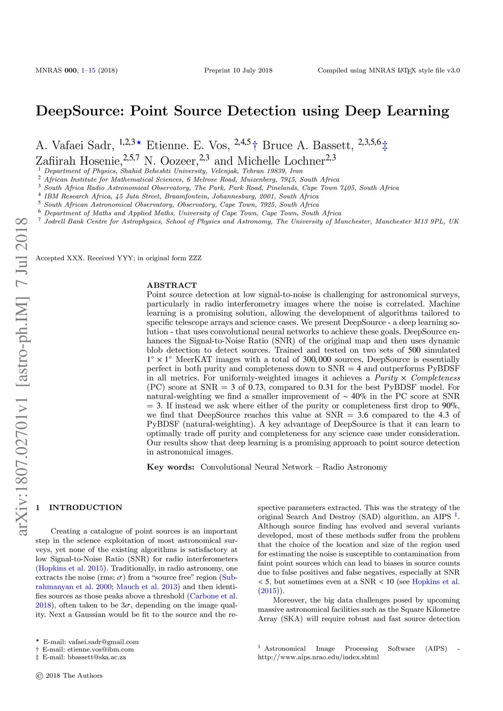 Point source detection at low signal-to-noise is challenging for astronomical surveys, particularly in radio interferometry images where the noise is correlated. Machine learning is a promising solution, allowing the development of algorithms tailored to specific telescope arrays and science cases. We present DeepSource - a deep learning solution - that uses convolutional neural networks to achieve these goals. DeepSource enhances the Signal-to-Noise Ratio (SNR) of the original map and then uses dynamic blob detection to detect sources. Trained and tested on two sets of 500 simulated 1 deg x 1 deg MeerKAT images with a total of 300,000 sources, DeepSource is essentially perfect in both purity and completeness down to SNR = 4 and outperforms PyBDSF in all metrics. For uniformly-weighted images it achieves a Purity x Completeness (PC) score at SNR = 3 of 0.73, compared to 0.31 for the best PyBDSF model. For natural-weighting we find a smaller improvement of ~40% in the PC score at SNR = 3. If instead we ask where either of the purity or completeness first drop to 90%, we find that DeepSource reaches this value at SNR = 3.6 compared to the 4.3 of PyBDSF (natural-weighting). A key advantage of DeepSource is that it can learn to optimally trade off purity and completeness for any science case under consideration. Our results show that deep learning is a promising approach to point source detection in astronomical images.