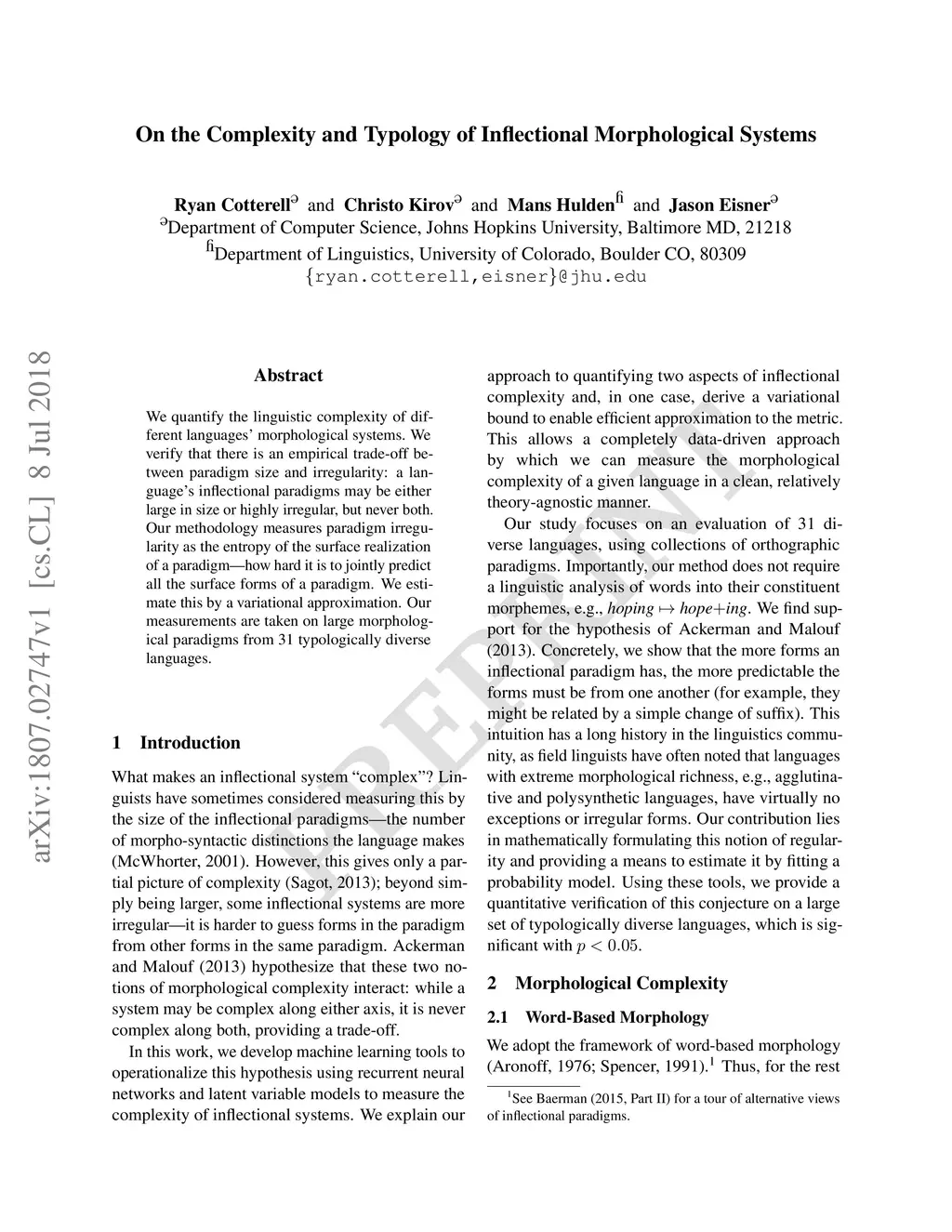 We quantify the linguistic complexity of different languages' morphological systems. We verify that there is an empirical trade-off between paradigm size and irregularity: a language's inflectional paradigms may be either large in size or highly irregular, but never both. Our methodology measures paradigm irregularity as the entropy of the surface realization of a paradigm -- how hard it is to jointly predict all the surface forms of a paradigm. We estimate this by a variational approximation. Our measurements are taken on large morphological paradigms from 31 typologically diverse languages.