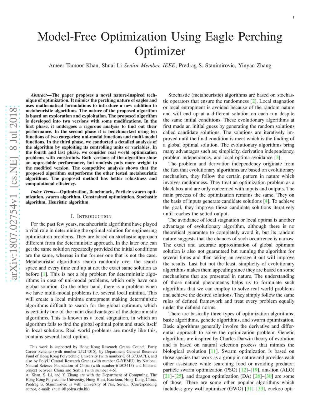 The paper proposes a novel nature-inspired technique of optimization. It mimics the perching nature of eagles and uses mathematical formulations to introduce a new addition to metaheuristic algorithms. The nature of the proposed algorithm is based on exploration and exploitation. The proposed algorithm is developed into two versions with some modifications. In the first phase, it undergoes a rigorous analysis to find out their performance. In the second phase it is benchmarked using ten functions of two categories; uni-modal functions and multi-modal functions. In the third phase, we conducted a detailed analysis of the algorithm by exploiting its controlling units or variables. In the fourth and last phase, we consider real world optimization problems with constraints. Both versions of the algorithm show an appreciable performance, but analysis puts more weight to the modified version. The competitive analysis shows that the proposed algorithm outperforms the other tested metaheuristic algorithms. The proposed method has better robustness and computational efficiency.