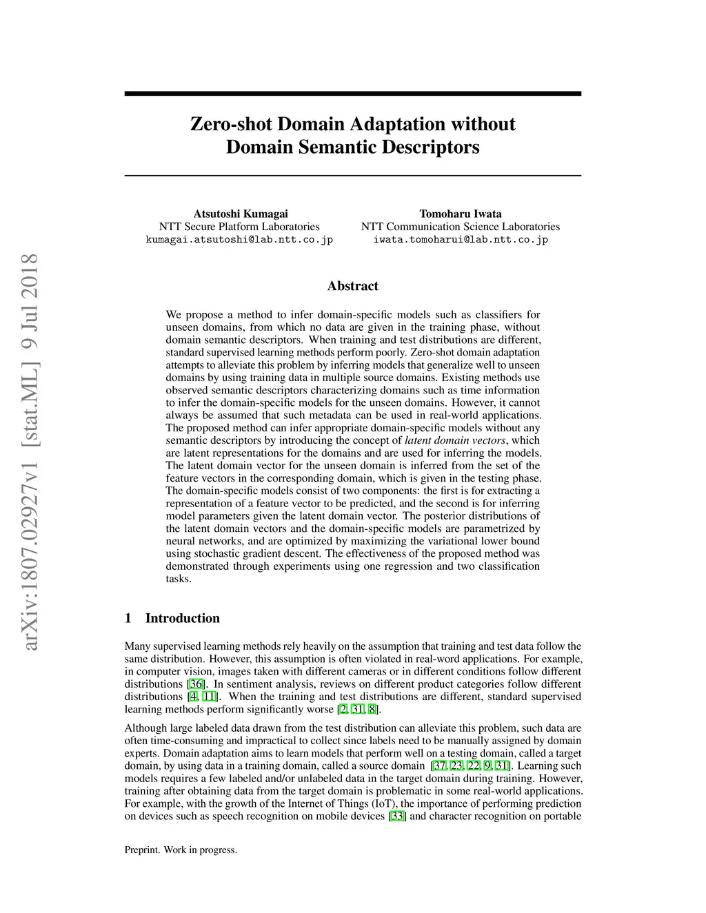 We propose a method to infer domain-specific models such as classifiers for unseen domains, from which no data are given in the training phase, without domain semantic descriptors. When training and test distributions are different, standard supervised learning methods perform poorly. Zero-shot domain adaptation attempts to alleviate this problem by inferring models that generalize well to unseen domains by using training data in multiple source domains. Existing methods use observed semantic descriptors characterizing domains such as time information to infer the domain-specific models for the unseen domains. However, it cannot always be assumed that such metadata can be used in real-world applications. The proposed method can infer appropriate domain-specific models without any semantic descriptors by introducing the concept of latent domain vectors, which are latent representations for the domains and are used for inferring the models. The latent domain vector for the unseen domain is inferred from the set of the feature vectors in the corresponding domain, which is given in the testing phase. The domain-specific models consist of two components: the first is for extracting a representation of a feature vector to be predicted, and the second is for inferring model parameters given the latent domain vector. The posterior distributions of the latent domain vectors and the domain-specific models are parametrized by neural networks, and are optimized by maximizing the variational lower bound using stochastic gradient descent. The effectiveness of the proposed method was demonstrated through experiments using one regression and two classification tasks.