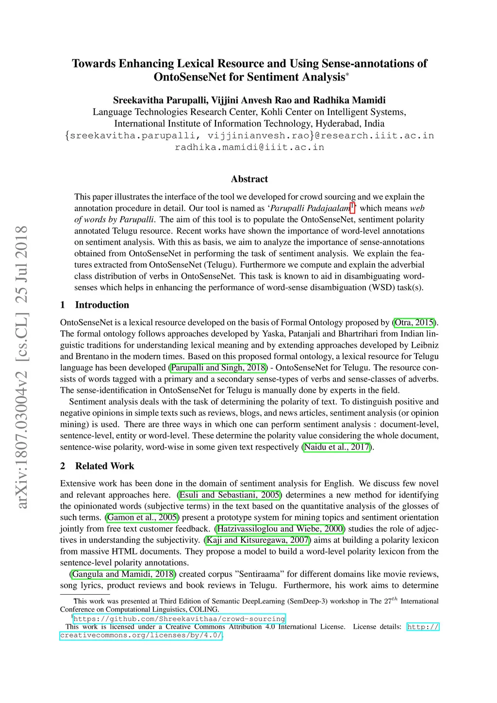 This paper illustrates the interface of the tool we developed for crowd sourcing and we explain the annotation procedure in detail. Our tool is named as 'Parupalli Padajaalam' which means web of words by Parupalli. The aim of this tool is to populate the OntoSenseNet, sentiment polarity annotated Telugu resource. Recent works have shown the importance of word-level annotations on sentiment analysis. With this as basis, we aim to analyze the importance of sense-annotations obtained from OntoSenseNet in performing the task of sentiment analysis. We explain the fea- tures extracted from OntoSenseNet (Telugu). Furthermore we compute and explain the adverbial class distribution of verbs in OntoSenseNet. This task is known to aid in disambiguating word-senses which helps in enhancing the performance of word-sense disambiguation (WSD) task(s).