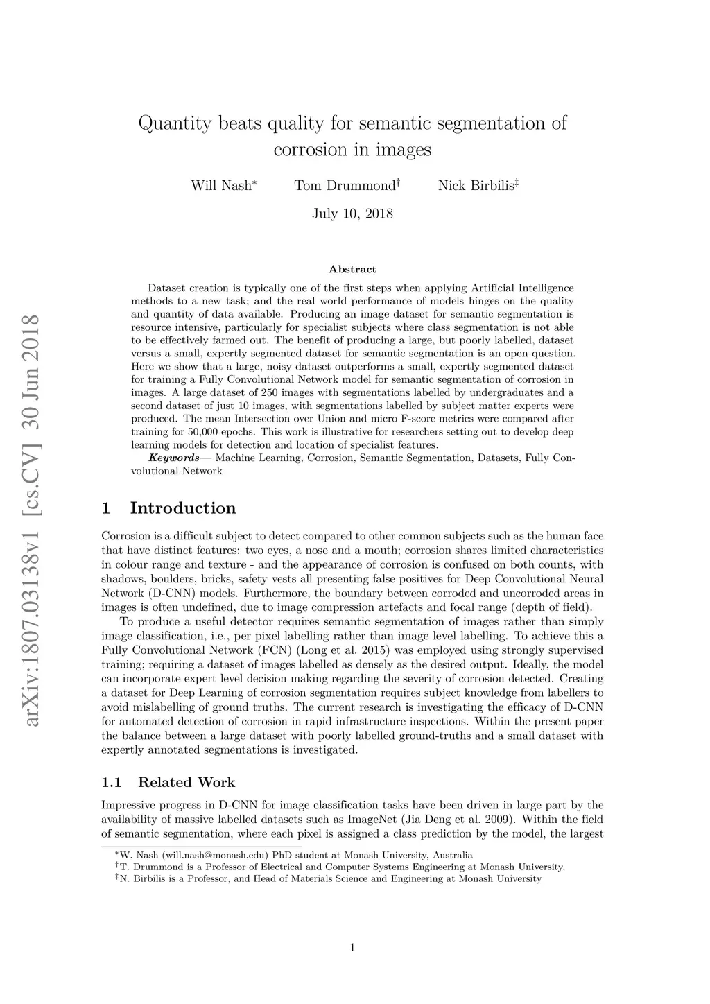 Dataset creation is typically one of the first steps when applying Artificial Intelligence methods to a new task; and the real world performance of models hinges on the quality and quantity of data available. Producing an image dataset for semantic segmentation is resource intensive, particularly for specialist subjects where class segmentation is not able to be effectively farmed out. The benefit of producing a large, but poorly labelled, dataset versus a small, expertly segmented dataset for semantic segmentation is an open question. Here we show that a large, noisy dataset outperforms a small, expertly segmented dataset for training a Fully Convolutional Network model for semantic segmentation of corrosion in images. A large dataset of 250 images with segmentations labelled by undergraduates and a second dataset of just 10 images, with segmentations labelled by subject matter experts were produced. The mean Intersection over Union and micro F-score metrics were compared after training for 50,000 epochs. This work is illustrative for researchers setting out to develop deep learning models for detection and location of specialist features.