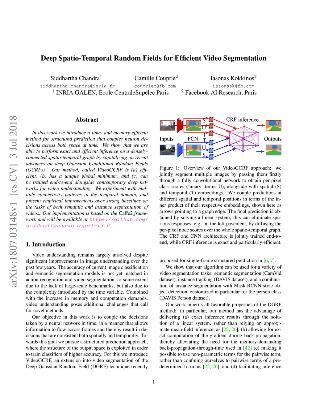 In this work we introduce a time- and memory-efficient method for structured prediction that couples neuron decisions across both space at time. We show that we are able to perform exact and efficient inference on a densely connected spatio-temporal graph by capitalizing on recent advances on deep Gaussian Conditional Random Fields (GCRFs). Our method, called VideoGCRF is (a) efficient, (b) has a unique global minimum, and (c) can be trained end-to-end alongside contemporary deep networks for video understanding. We experiment with multiple connectivity patterns in the temporal domain, and present empirical improvements over strong baselines on the tasks of both semantic and instance segmentation of videos.