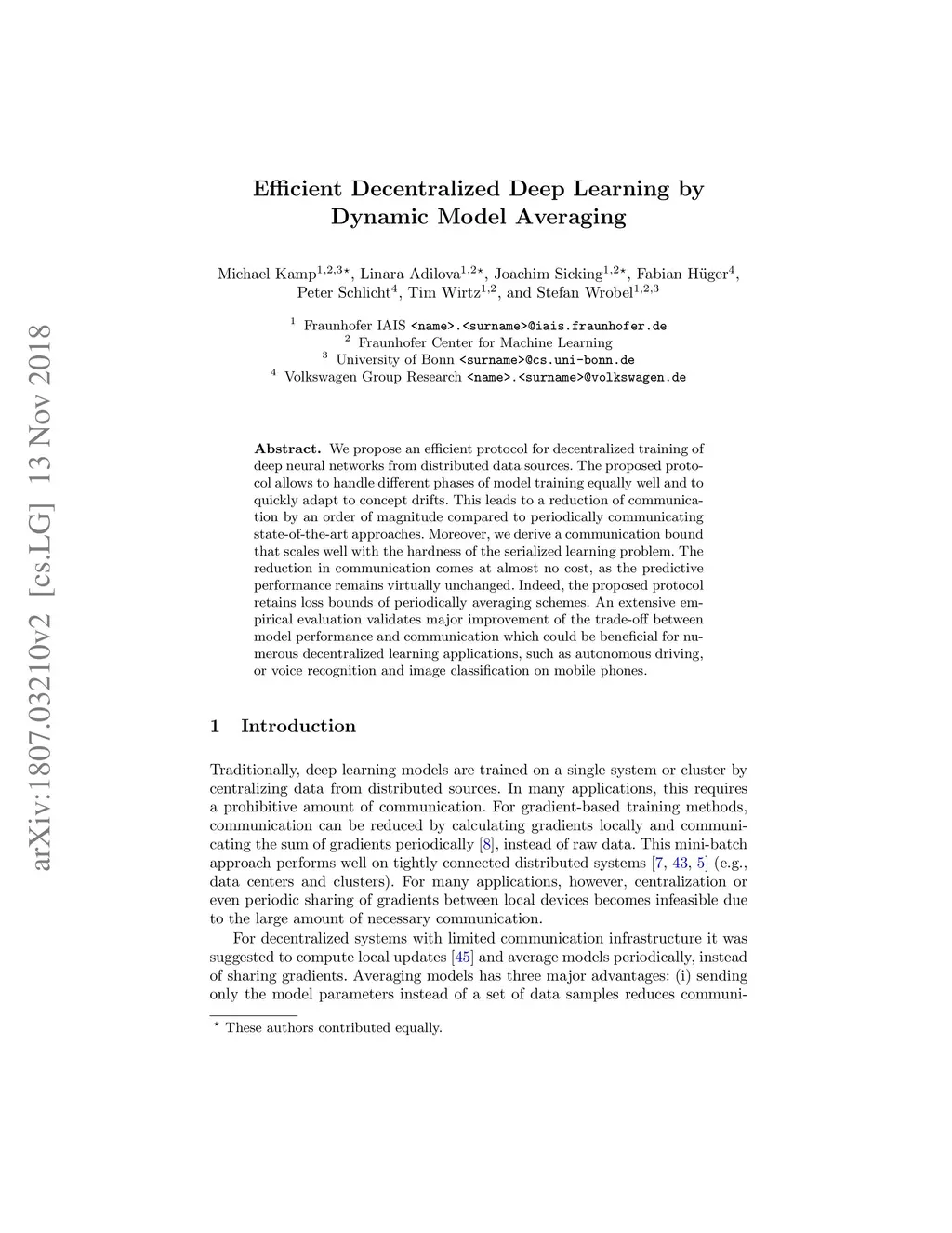 We propose an efficient protocol for decentralized training of deep neural networks from distributed data sources. The proposed protocol allows to handle different phases of model training equally well and to quickly adapt to concept drifts. This leads to a reduction of communication by an order of magnitude compared to periodically communicating state-of-the-art approaches. Moreover, we derive a communication bound that scales well with the hardness of the serialized learning problem. The reduction in communication comes at almost no cost, as the predictive performance remains virtually unchanged. Indeed, the proposed protocol retains loss bounds of periodically averaging schemes. An extensive empirical evaluation validates major improvement of the trade-off between model performance and communication which could be beneficial for numerous decentralized learning applications, such as autonomous driving, or voice recognition and image classification on mobile phones.
