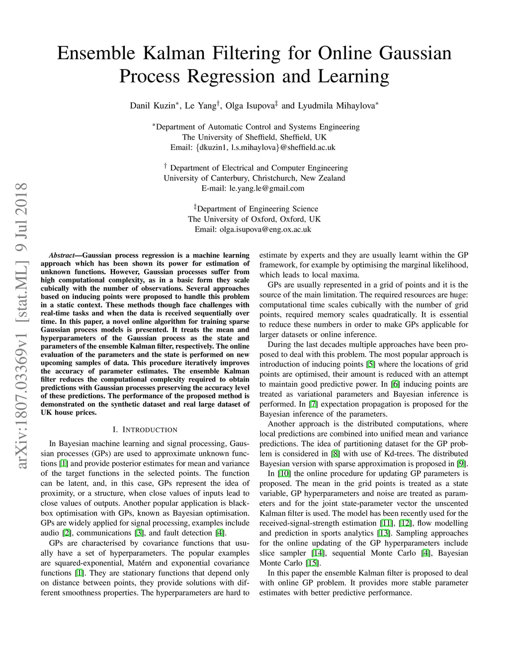 Gaussian process regression is a machine learning approach which has been shown its power for estimation of unknown functions. However, Gaussian processes suffer from high computational complexity, as in a basic form they scale cubically with the number of observations. Several approaches based on inducing points were proposed to handle this problem in a static context. These methods though face challenges with real-time tasks and when the data is received sequentially over time. In this paper, a novel online algorithm for training sparse Gaussian process models is presented. It treats the mean and hyperparameters of the Gaussian process as the state and parameters of the ensemble Kalman filter, respectively. The online evaluation of the parameters and the state is performed on new upcoming samples of data. This procedure iteratively improves the accuracy of parameter estimates. The ensemble Kalman filter reduces the computational complexity required to obtain predictions with Gaussian processes preserving the accuracy level of these predictions. The performance of the proposed method is demonstrated on the synthetic dataset and real large dataset of UK house prices.