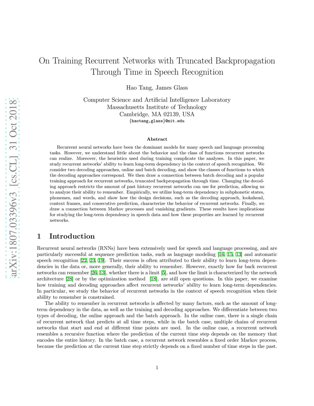 Recurrent neural networks have been the dominant models for many speech and language processing tasks. However, we understand little about the behavior and the class of functions recurrent networks can realize. Moreover, the heuristics used during training complicate the analyses. In this paper, we study recurrent networks' ability to learn long-term dependency in the context of speech recognition. We consider two decoding approaches, online and batch decoding, and show the classes of functions to which the decoding approaches correspond. We then draw a connection between batch decoding and a popular training approach for recurrent networks, truncated backpropagation through time. Changing the decoding approach restricts the amount of past history recurrent networks can use for prediction, allowing us to analyze their ability to remember. Empirically, we utilize long-term dependency in subphonetic states, phonemes, and words, and show how the design decisions, such as the decoding approach, lookahead, context frames, and consecutive prediction, characterize the behavior of recurrent networks. Finally, we draw a connection between Markov processes and vanishing gradients. These results have implications for studying the long-term dependency in speech data and how these properties are learned by recurrent networks.