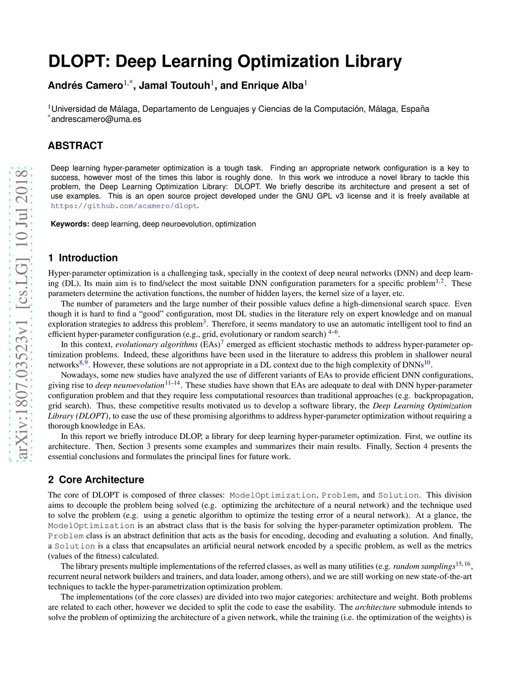 Deep learning hyper-parameter optimization is a tough task. Finding an appropriate network configuration is a key to success, however most of the times this labor is roughly done. In this work we introduce a novel library to tackle this problem, the Deep Learning Optimization Library: DLOPT. We briefly describe its architecture and present a set of use examples. This is an open source project developed under the GNU GPL v3 license and it is freely available at https://github.com/acamero/dlopt