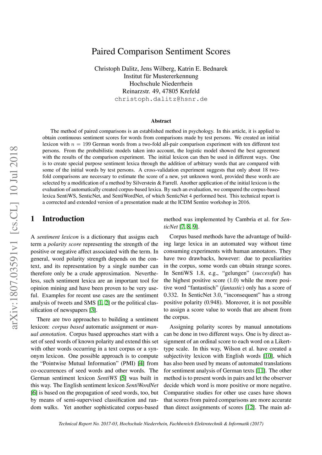 The method of paired comparisons is an established method in psychology. In this article, it is applied to obtain continuous sentiment scores for words from comparisons made by test persons. We created an initial lexicon with German words from a two-fold all-pair comparison experiment with ten different test persons. From the probabilistic models taken into account, the logistic model showed the best agreement with the results of the comparison experiment. The initial lexicon can then be used in different ways. One is to create special purpose sentiment lexica through the addition of arbitrary words that are compared with some of the initial words by test persons. A cross-validation experiment suggests that only about 18 two-fold comparisons are necessary to estimate the score of a new, yet unknown word, provided these words are selected by a modification of a method by Silverstein & Farrell. Another application of the initial lexicon is the evaluation of automatically created corpus-based lexica. By such an evaluation, we compared the corpus-based lexica SentiWS, SenticNet, and SentiWordNet, of which SenticNet 4 performed best. This technical report is a corrected and extended version of a presentation made at the ICDM Sentire workshop in 2016.