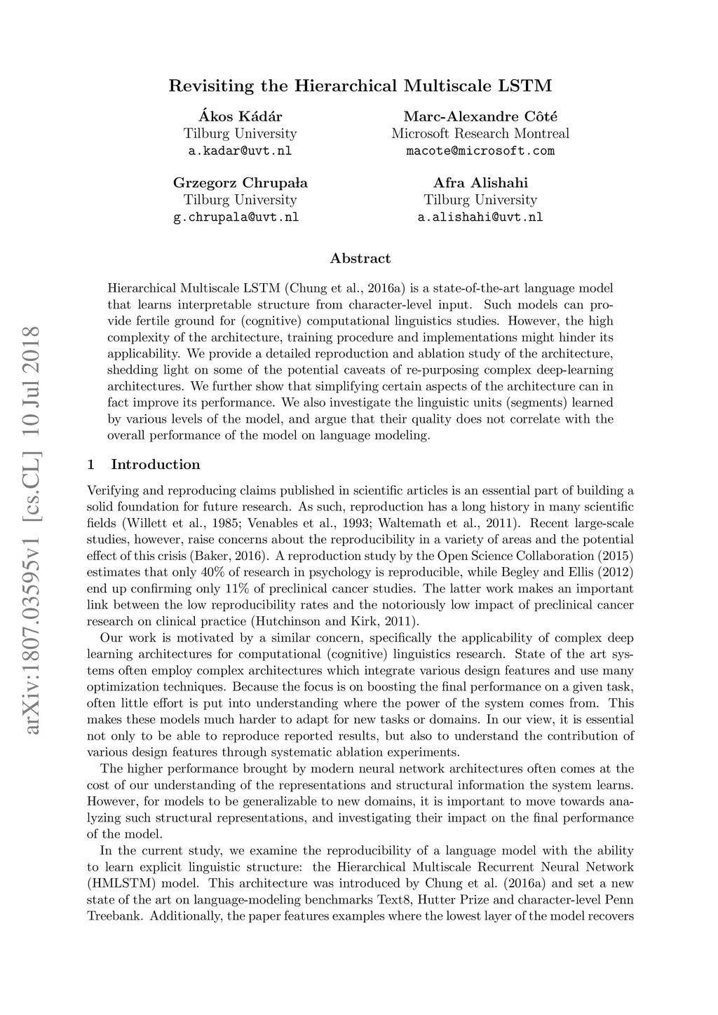 Hierarchical Multiscale LSTM (Chung et al., 2016a) is a state-of-the-art language model that learns interpretable structure from character-level input. Such models can provide fertile ground for (cognitive) computational linguistics studies. However, the high complexity of the architecture, training procedure and implementations might hinder its applicability. We provide a detailed reproduction and ablation study of the architecture, shedding light on some of the potential caveats of re-purposing complex deep-learning architectures. We further show that simplifying certain aspects of the architecture can in fact improve its performance. We also investigate the linguistic units (segments) learned by various levels of the model, and argue that their quality does not correlate with the overall performance of the model on language modeling.