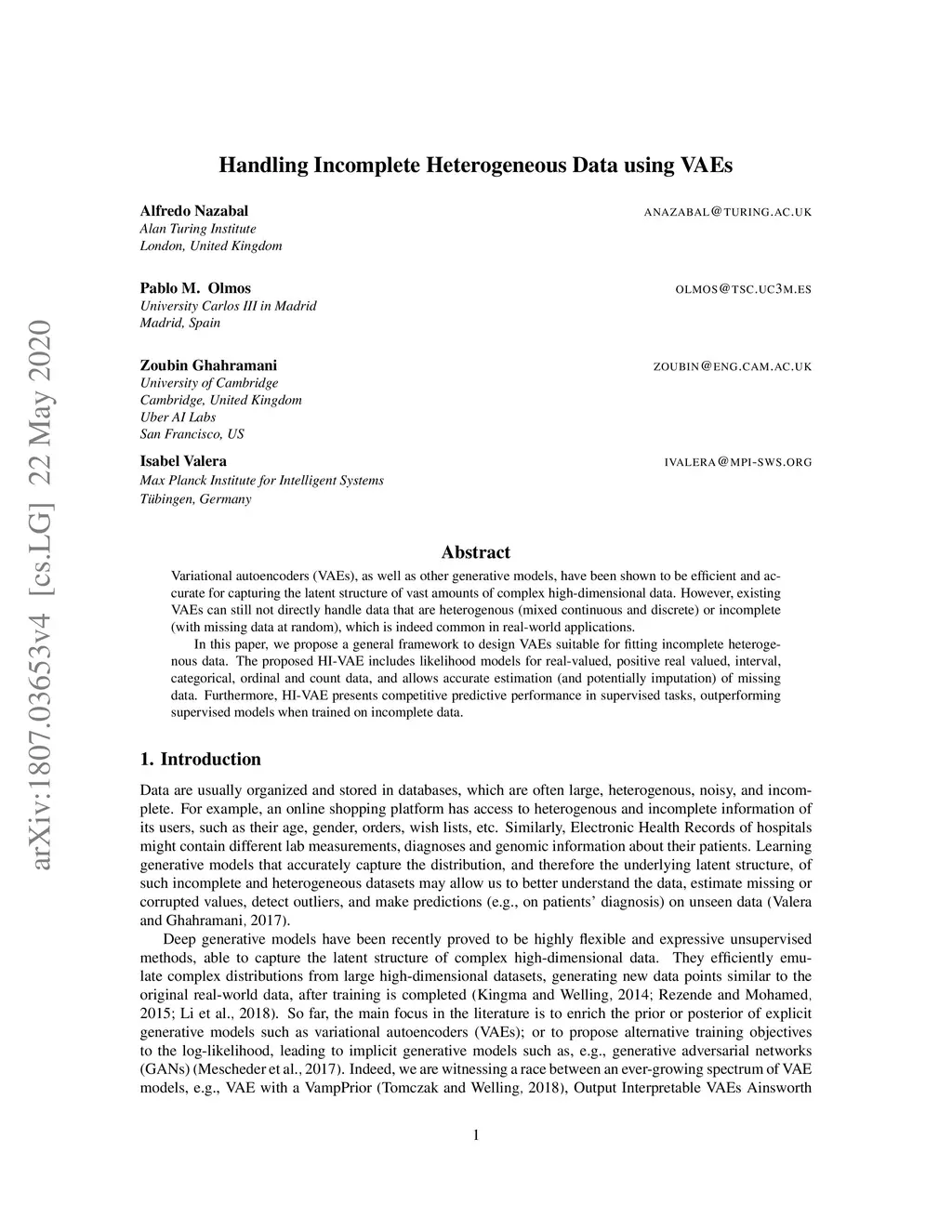 Variational autoencoders (VAEs), as well as other generative models, have been shown to be efficient and accurate for capturing the latent structure of vast amounts of complex high-dimensional data. However, existing VAEs can still not directly handle data that are heterogenous (mixed continuous and discrete) or incomplete (with missing data at random), which is indeed common in real-world applications. In this paper, we propose a general framework to design VAEs suitable for fitting incomplete heterogenous data. The proposed HI-VAE includes likelihood models for real-valued, positive real valued, interval, categorical, ordinal and count data, and allows accurate estimation (and potentially imputation) of missing data. Furthermore, HI-VAE presents competitive predictive performance in supervised tasks, outperforming supervised models when trained on incomplete data.
