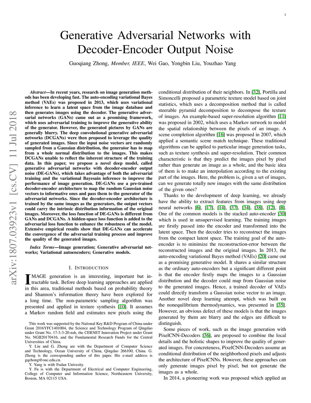 In recent years, research on image generation methods has been developing fast. The auto-encoding variational Bayes method (VAEs) was proposed in 2013, which uses variational inference to learn a latent space from the image database and then generates images using the decoder. The generative adversarial networks (GANs) came out as a promising framework, which uses adversarial training to improve the generative ability of the generator. However, the generated pictures by GANs are generally blurry. The deep convolutional generative adversarial networks (DCGANs) were then proposed to leverage the quality of generated images. Since the input noise vectors are randomly sampled from a Gaussian distribution, the generator has to map from a whole normal distribution to the images. This makes DCGANs unable to reflect the inherent structure of the training data. In this paper, we propose a novel deep model, called generative adversarial networks with decoder-encoder output noise (DE-GANs), which takes advantage of both the adversarial training and the variational Bayesain inference to improve the performance of image generation. DE-GANs use a pre-trained decoder-encoder architecture to map the random Gaussian noise vectors to informative ones and pass them to the generator of the adversarial networks. Since the decoder-encoder architecture is trained by the same images as the generators, the output vectors could carry the intrinsic distribution information of the original images. Moreover, the loss function of DE-GANs is different from GANs and DCGANs. A hidden-space loss function is added to the adversarial loss function to enhance the robustness of the model. Extensive empirical results show that DE-GANs can accelerate the convergence of the adversarial training process and improve the quality of the generated images.