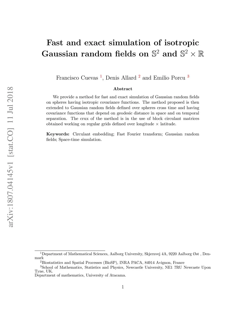 We provide a method for fast and exact simulation of Gaussian random fields on spheres having isotropic covariance functions. The method proposed is then extended to Gaussian random fields defined over spheres cross time and having covariance functions that depend on geodesic distance in space and on temporal separation. The crux of the method is in the use of block circulant matrices obtained working on regular grids defined over longitude latitude.