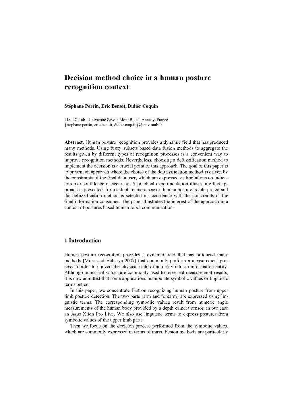 Human posture recognition provides a dynamic field that has produced many methods. Using fuzzy subsets based data fusion methods to aggregate the results given by different types of recognition processes is a convenient way to improve recognition methods. Nevertheless, choosing a defuzzification method to imple-ment the decision is a crucial point of this approach. The goal of this paper is to present an approach where the choice of the defuzzification method is driven by the constraints of the final data user, which are expressed as limitations on indica-tors like confidence or accuracy. A practical experimentation illustrating this ap-proach is presented: from a depth camera sensor, human posture is interpreted and the defuzzification method is selected in accordance with the constraints of the final information consumer. The paper illustrates the interest of the approach in a context of postures based human robot communication.