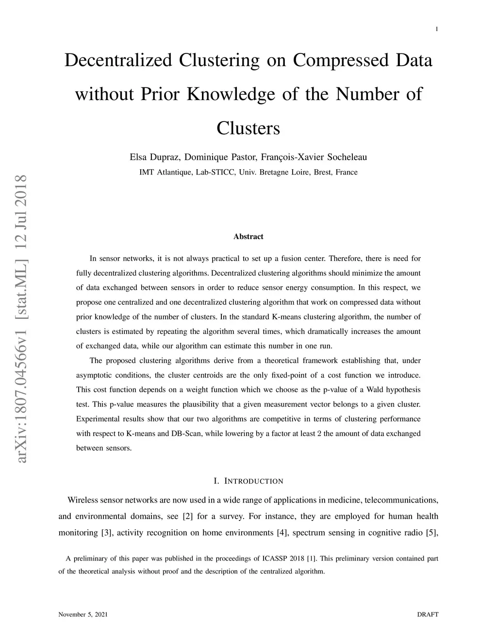In sensor networks, it is not always practical to set up a fusion center. Therefore, there is need for fully decentralized clustering algorithms. Decentralized clustering algorithms should minimize the amount of data exchanged between sensors in order to reduce sensor energy consumption. In this respect, we propose one centralized and one decentralized clustering algorithm that work on compressed data without prior knowledge of the number of clusters. In the standard K-means clustering algorithm, the number of clusters is estimated by repeating the algorithm several times, which dramatically increases the amount of exchanged data, while our algorithm can estimate this number in one run. The proposed clustering algorithms derive from a theoretical framework establishing that, under asymptotic conditions, the cluster centroids are the only fixed-point of a cost function we introduce. This cost function depends on a weight function which we choose as the p-value of a Wald hypothesis test. This p-value measures the plausibility that a given measurement vector belongs to a given cluster. Experimental results show that our two algorithms are competitive in terms of clustering performance with respect to K-means and DB-Scan, while lowering by a factor at least the amount of data exchanged between sensors.
