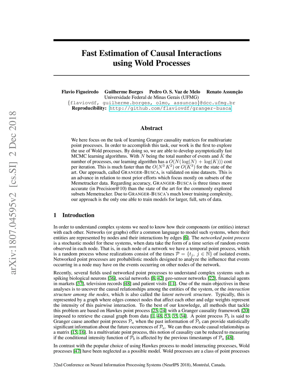 We here focus on the task of learning Granger causality matrices for multivariate point processes. In order to accomplish this task, our work is the first to explore the use of Wold processes. By doing so, we are able to develop asymptotically fast MCMC learning algorithms. With being the total number of events and the number of processes, our learning algorithm has a cost per iteration. This is much faster than the or for the state of the art. Our approach, called GrangerBusca, is validated on nine datasets. This is an advance in relation to most prior efforts which focus mostly on subsets of the Memetracker data. Regarding accuracy, GrangerBusca is three times more accurate (in Precision@10) than the state of the art for the commonly explored subsets Memetracker. Due to GrangerBusca's much lower training complexity, our approach is the only one able to train models for larger, full, sets of data.