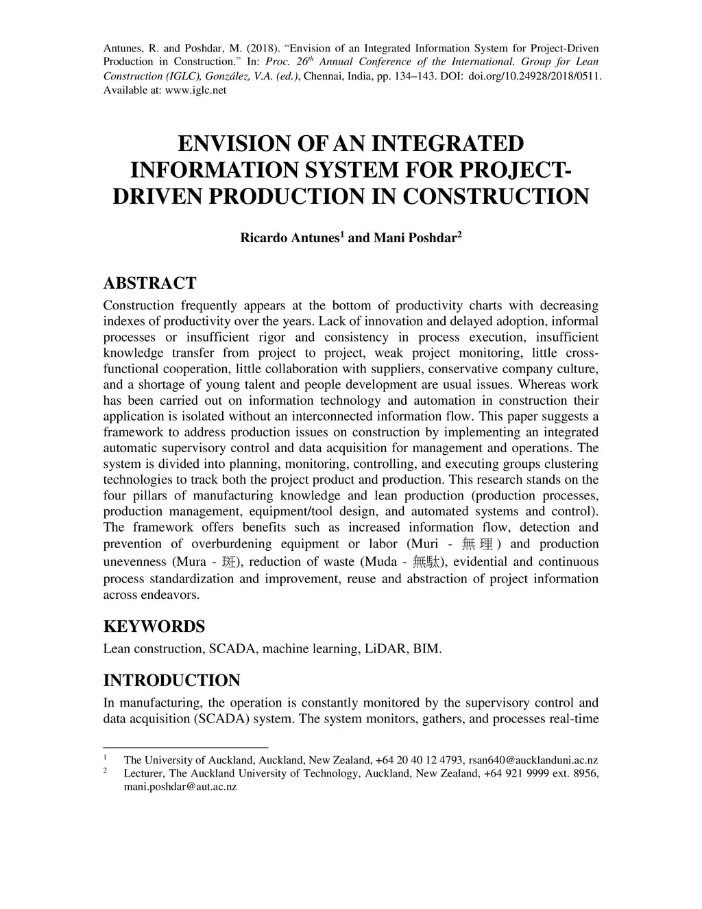 Construction frequently appears at the bottom of productivity charts with decreasing indexes of productivity over the years. Lack of innovation and delayed adoption, informal processes or insufficient rigor and consistency in process execution, insufficient knowledge transfer from project to project, weak project monitoring, little cross- functional cooperation, little collaboration with suppliers, conservative company culture, and a shortage of young talent and people development are usual issues. Whereas work has been carried out on information technology and automation in construction their application is isolated without an interconnected information flow. This paper suggests a framework to address production issues on construction by implementing an integrated automatic supervisory control and data acquisition for management and operations. The system is divided into planning, monitoring, controlling, and executing groups clustering technologies to track both the project product and production. This research stands on the four pillars of manufacturing knowledge and lean production (production processes, production management, equipment/tool design, and automated systems and control). The framework offers benefits such as increased information flow, detection and prevention of overburdening equipment or labor (Muri) and production unevenness (Mura), reduction of waste (Muda), evidential and continuous process standardization and improvement, reuse and abstraction of project information across endeavors.