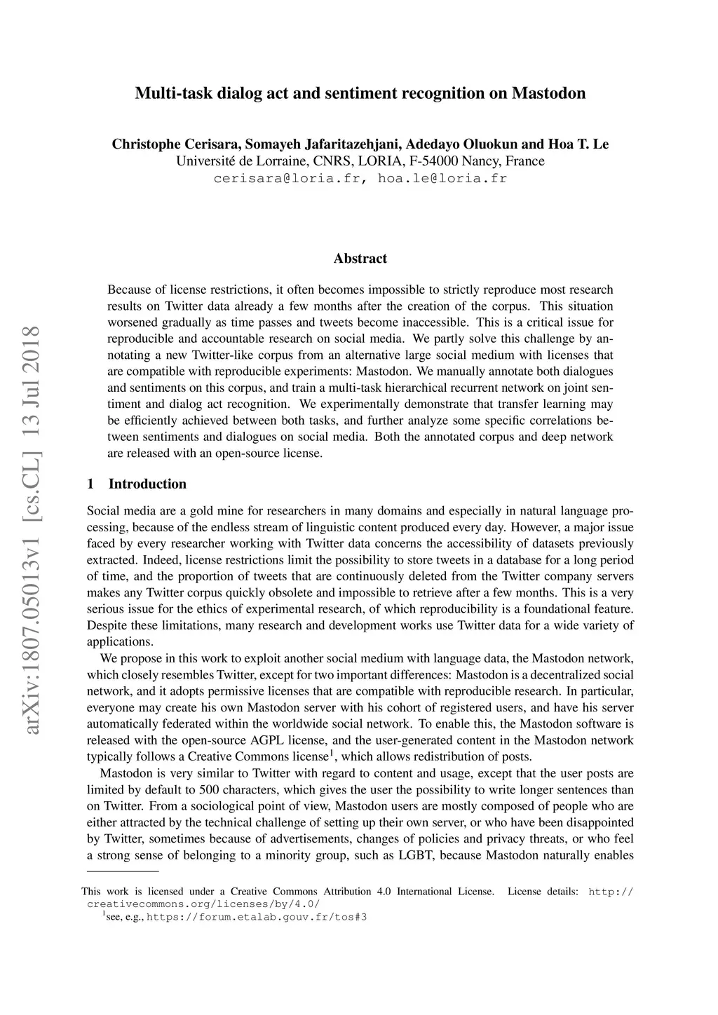 Because of license restrictions, it often becomes impossible to strictly reproduce most research results on Twitter data already a few months after the creation of the corpus. This situation worsened gradually as time passes and tweets become inaccessible. This is a critical issue for reproducible and accountable research on social media. We partly solve this challenge by annotating a new Twitter-like corpus from an alternative large social medium with licenses that are compatible with reproducible experiments: Mastodon. We manually annotate both dialogues and sentiments on this corpus, and train a multi-task hierarchical recurrent network on joint sentiment and dialog act recognition. We experimentally demonstrate that transfer learning may be efficiently achieved between both tasks, and further analyze some specific correlations between sentiments and dialogues on social media. Both the annotated corpus and deep network are released with an open-source license.