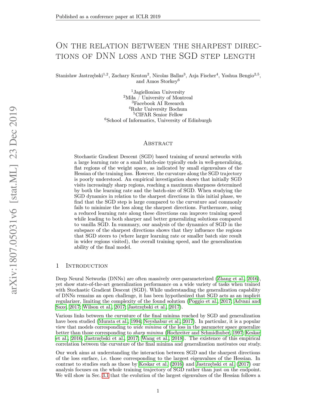 Stochastic Gradient Descent (SGD) based training of neural networks with a large learning rate or a small batch-size typically ends in well-generalizing, flat regions of the weight space, as indicated by small eigenvalues of the Hessian of the training loss. However, the curvature along the SGD trajectory is poorly understood. An empirical investigation shows that initially SGD visits increasingly sharp regions, reaching a maximum sharpness determined by both the learning rate and the batch-size of SGD. When studying the SGD dynamics in relation to the sharpest directions in this initial phase, we find that the SGD step is large compared to the curvature and commonly fails to minimize the loss along the sharpest directions. Furthermore, using a reduced learning rate along these directions can improve training speed while leading to both sharper and better generalizing solutions compared to vanilla SGD. In summary, our analysis of the dynamics of SGD in the subspace of the sharpest directions shows that they influence the regions that SGD steers to (where larger learning rate or smaller batch size result in wider regions visited), the overall training speed, and the generalization ability of the final model.