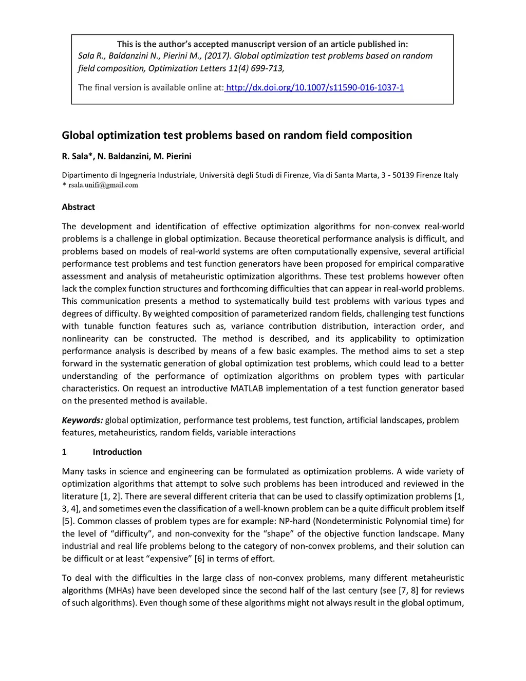 The development and identification of effective optimization algorithms for non-convex real-world problems is a challenge in global optimization. Because theoretical performance analysis is difficult, and problems based on models of real-world systems are often computationally expensive, several artificial performance test problems and test function generators have been proposed for empirical comparative assessment and analysis of metaheuristic optimization algorithms. These test problems however often lack the complex function structures and forthcoming difficulties that can appear in real-world problems. This communication presents a method to systematically build test problems with various types and degrees of difficulty. By weighted composition of parameterized random fields, challenging test functions with tunable function features such as, variance contribution distribution, interaction order, and nonlinearity can be constructed. The method is described, and its applicability to optimization performance analysis is described by means of a few basic examples. The method aims to set a step forward in the systematic generation of global optimization test problems, which could lead to a better understanding of the performance of optimization algorithms on problem types with particular characteristics. On request an introductive MATLAB implementation of a test function generator based on the presented method is available.