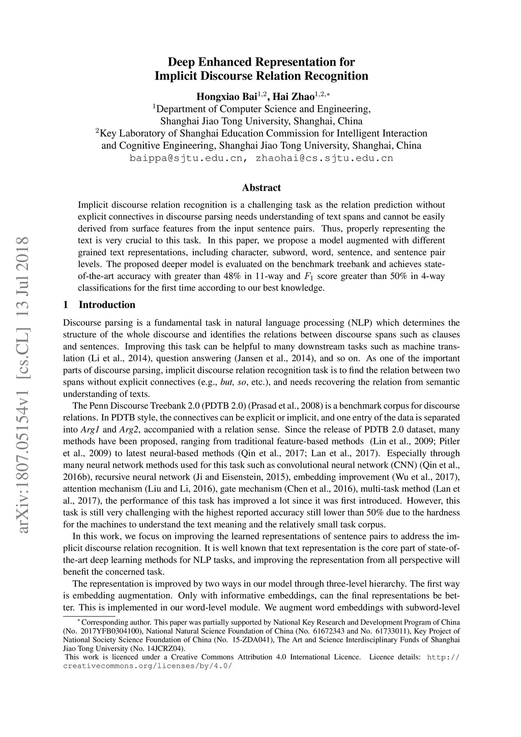 Deep Enhanced Representation for Implicit Discourse Relation Recognition