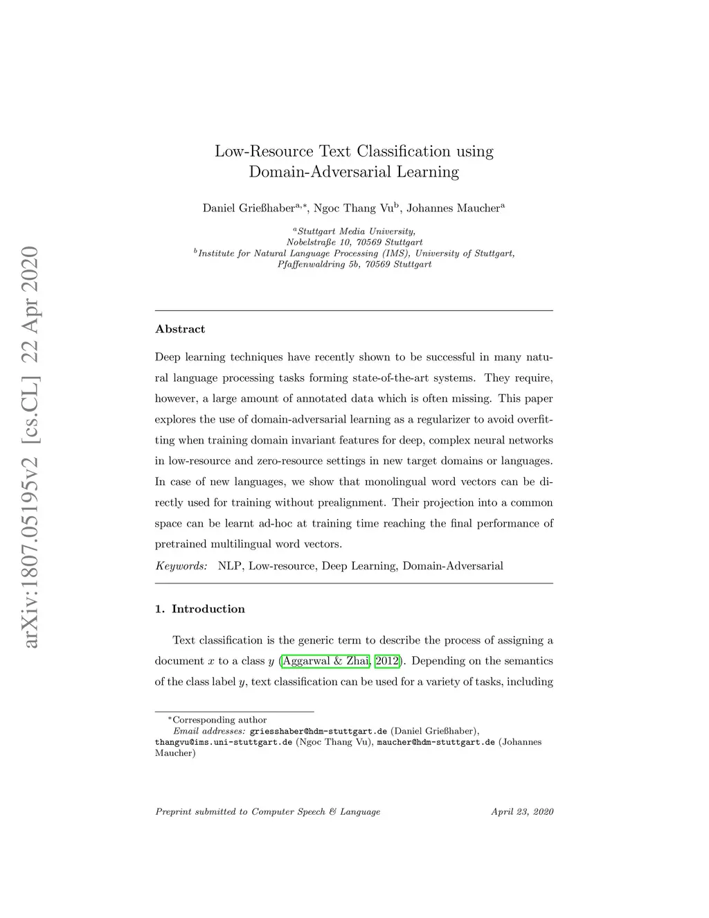 Low-Resource Text Classification using Domain-Adversarial Learning