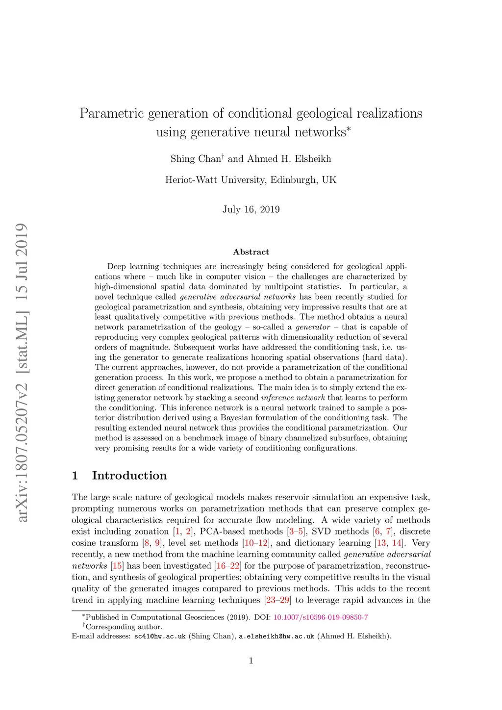 We introduce a method for parametric generation of conditional geological realizations using generative neural networks. We build on our recent work where we trained a neural network to generate unconditional geological realizations using generative adversarial networks. Here we propose a method for post-hoc conditioning of pre-trained generator networks to generate conditional realizations. We frame the problem in the Bayesian setting and model the posterior distribution of the latent vector given observations. To efficiently generate multiple latent vector solutions, we train a neural network to generate samples from the posterior distribution. This inference network is trained by minimizing the discrepancy between its output distribution and the posterior. Once the inference network is trained, it is coupled to the (unconditional) generator to obtain the conditional generator, thus also maintaining a parametrization of the (conditional) generation process.