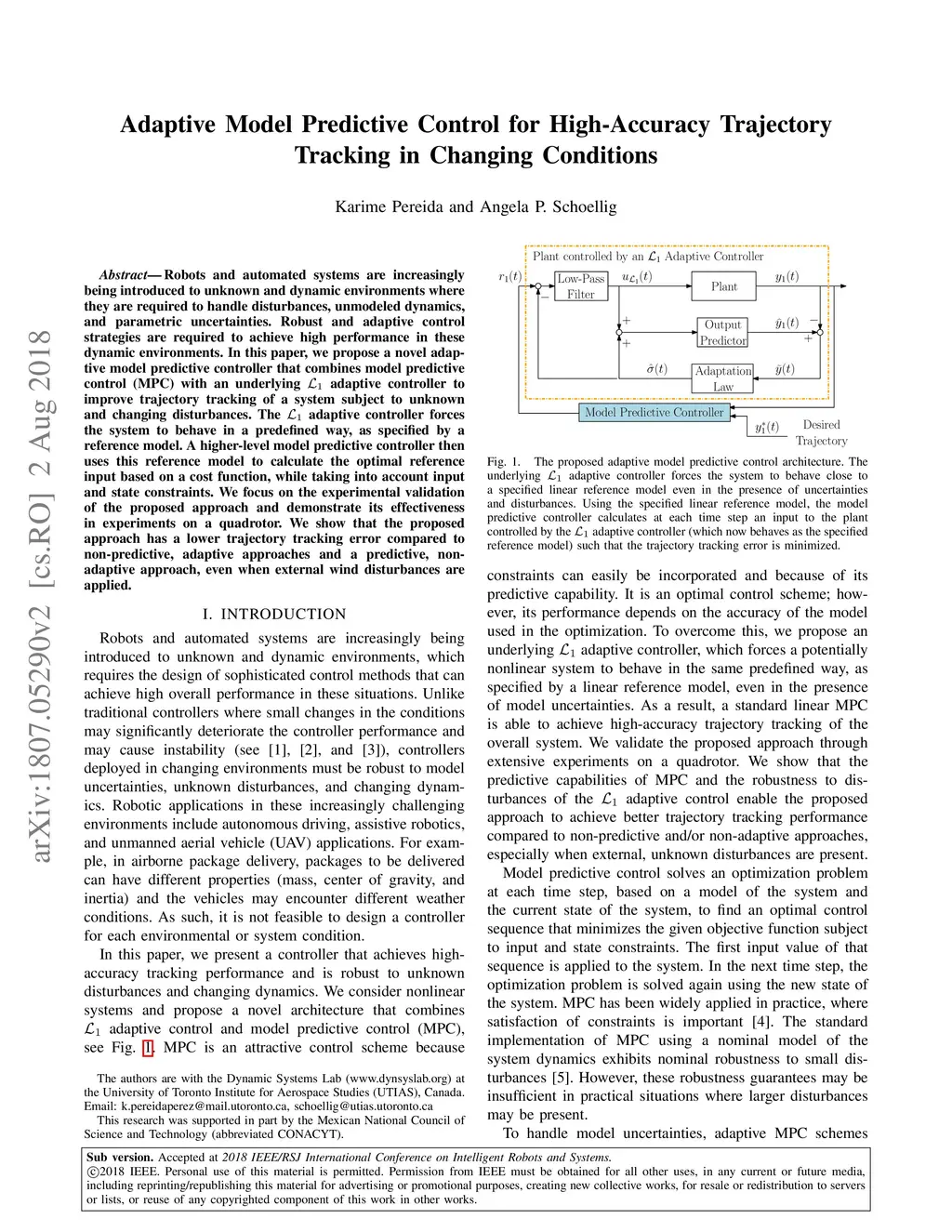 Robots and automated systems are increasingly being introduced to unknown and dynamic environments where they are required to handle disturbances, unmodeled dynamics, and parametric uncertainties. Robust and adaptive control strategies are required to achieve high performance in these dynamic environments. In this paper, we propose a novel adaptive model predictive controller that combines model predictive control (MPC) with an underlying adaptive controller to improve trajectory tracking of a system subject to unknown and changing disturbances. The adaptive controller forces the system to behave in a predefined way, as specified by a reference model. A higher-level model predictive controller then uses this reference model to calculate the optimal reference input based on a cost function, while taking into account input and state constraints. We focus on the experimental validation of the proposed approach and demonstrate its effectiveness in experiments on a quadrotor. We show that the proposed approach has a lower trajectory tracking error compared to non-predictive, adaptive approaches and a predictive, non-adaptive approach, even when external wind disturbances are applied.