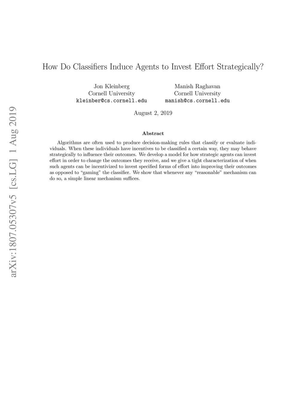 Algorithms are often used to produce decision-making rules that classify or evaluate individuals. When these individuals have incentives to be classified a certain way, they may behave strategically to influence their outcomes. We develop a model for how strategic agents can invest effort in order to change the outcomes they receive, and we give a tight characterization of when such agents can be incentivized to invest specified forms of effort into improving their outcomes as opposed to "gaming" the classifier. We show that whenever any "reasonable" mechanism can do so, a simple linear mechanism suffices.