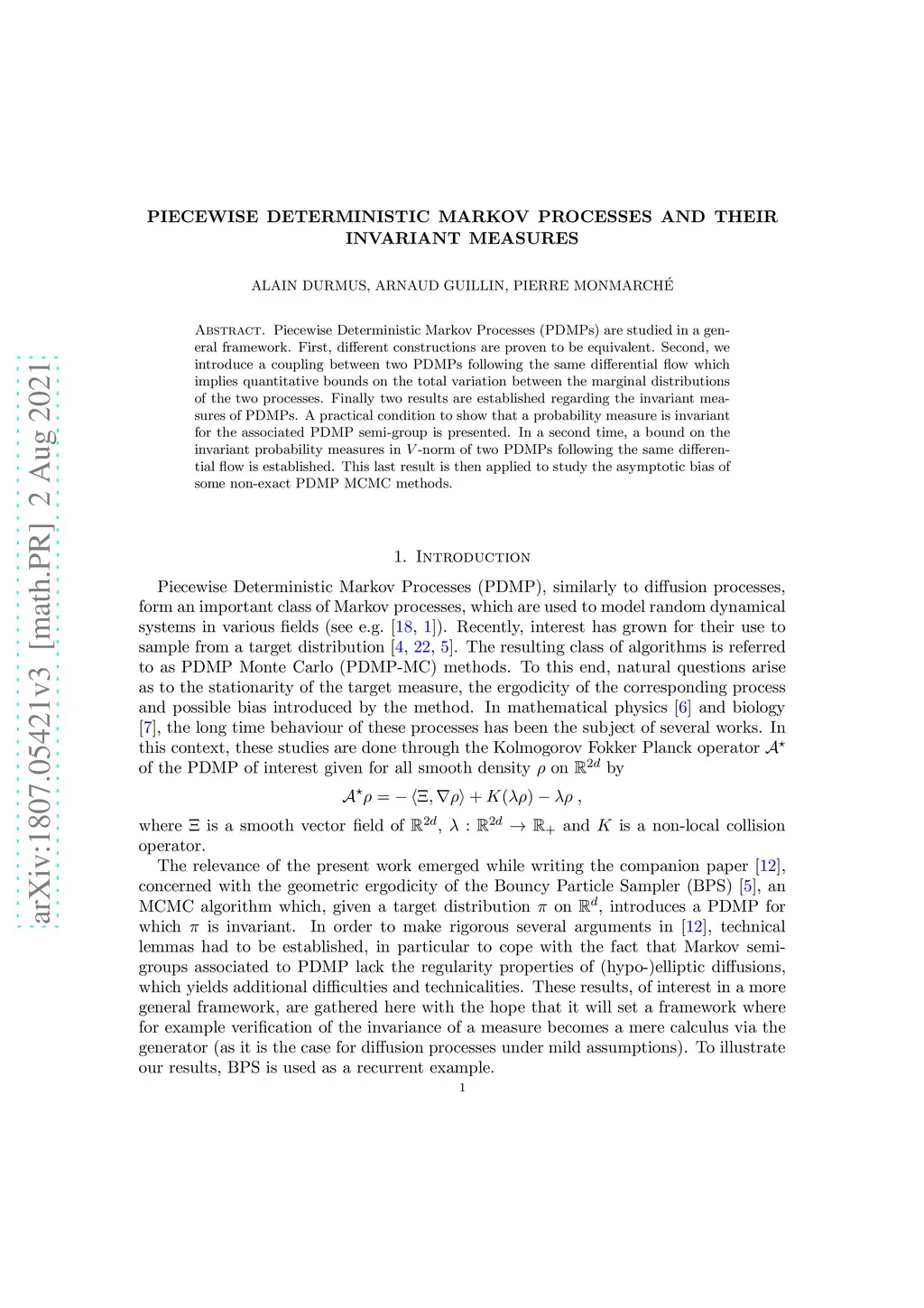 Piecewise Deterministic Markov Processes (PDMPs) are studied in a general framework. First, different constructions are proven to be equivalent. Second, we introduce a coupling between two PDMPs following the same differential flow which implies quantitative bounds on the total variation between the marginal distributions of the two processes. Finally two results are established regarding the invariant measures of PDMPs. A practical condition to show that a probability measure is invariant for the associated PDMP semi-group is presented. In a second time, a bound on the invariant probability measures in -norm of two PDMPs following the same differential flow is established. This last result is then applied to study the asymptotic bias of some non-exact PDMP MCMC methods.