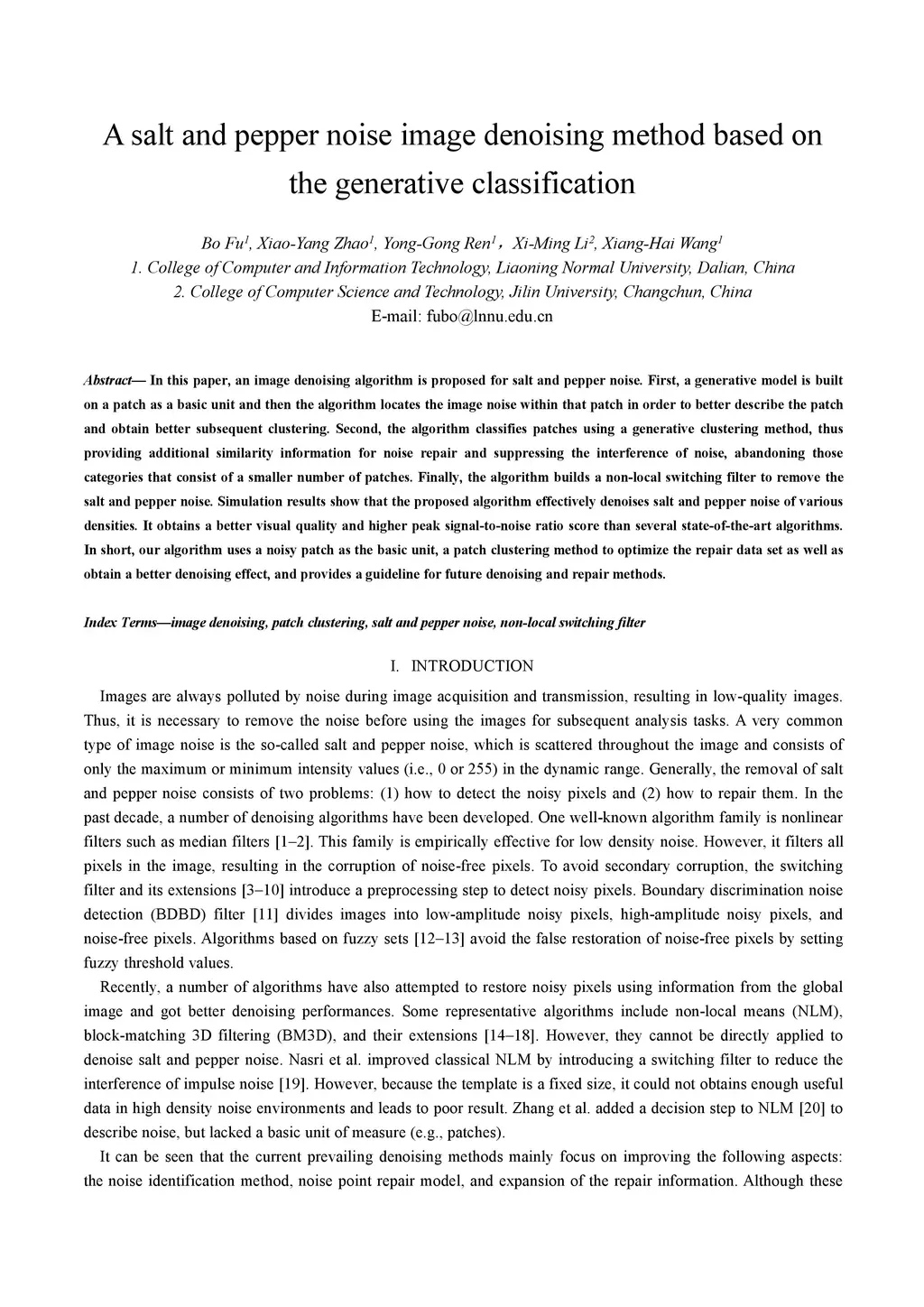 In this paper, an image denoising algorithm is proposed for salt and pepper noise. First, a generative model is built on a patch as a basic unit and then the algorithm locates the image noise within that patch in order to better describe the patch and obtain better subsequent clustering. Second, the algorithm classifies patches using a generative clustering method, thus providing additional similarity information for noise repair and suppressing the interference of noise, abandoning those categories that consist of a smaller number of patches. Finally, the algorithm builds a non-local switching filter to remove the salt and pepper noise. Simulation results show that the proposed algorithm effectively denoises salt and pepper noise of various densities. It obtains a better visual quality and higher peak signal-to-noise ratio score than several state-of-the-art algorithms. In short, our algorithm uses a noisy patch as the basic unit, a patch clustering method to optimize the repair data set as well as obtain a better denoising effect, and provides a guideline for future denoising and repair methods.