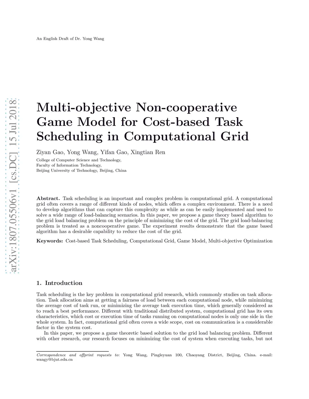 Multi-objective Non-cooperative Game Model for Cost-based Task