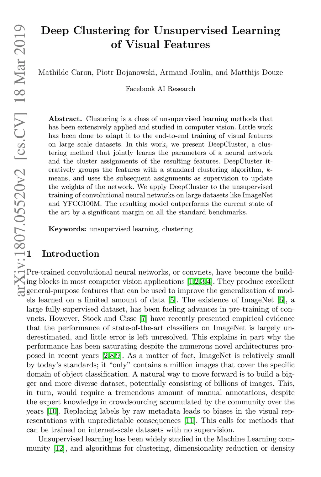 Clustering is a class of unsupervised learning methods that has been extensively applied and studied in computer vision. Little work has been done to adapt it to the end-to-end training of visual features on large scale datasets. In this work, we present DeepCluster, a clustering method that jointly learns the parameters of a neural network and the cluster assignments of the resulting features. DeepCluster iteratively groups the features with a standard clustering algorithm, k-means, and uses the subsequent assignments as supervision to update the weights of the network. We apply DeepCluster to the unsupervised training of convolutional neural networks on large datasets like ImageNet and YFCC100M. The resulting model outperforms the current state of the art by a significant margin on all the standard benchmarks.