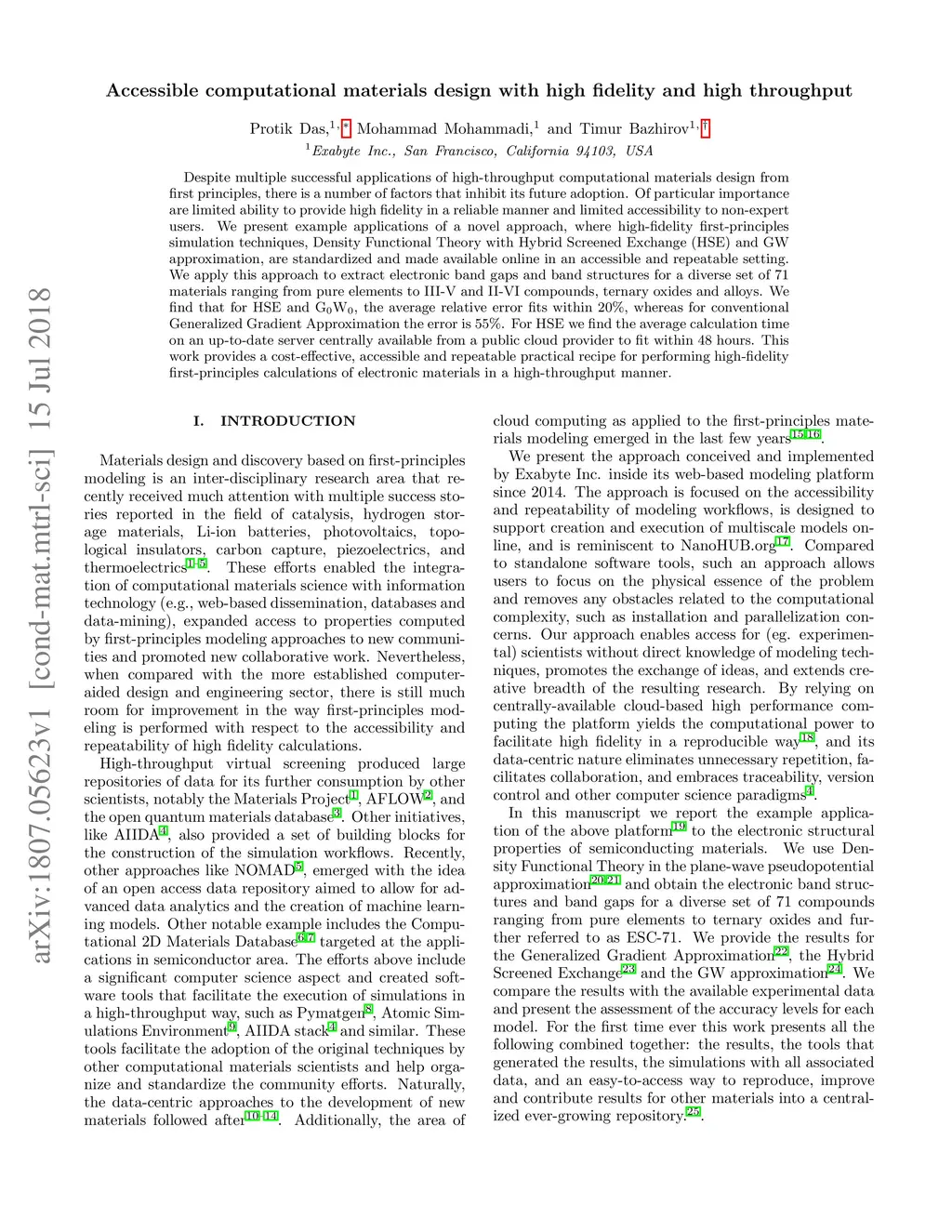 Despite multiple successful applications of high-throughput computational materials design from first principles, there is a number of factors that inhibit its future adoption. Of particular importance are limited ability to provide high fidelity in a reliable manner and limited accessibility to non-expert users. We present example applications of a novel approach, where high-fidelity first-principles simulation techniques, Density Functional Theory with Hybrid Screened Exchange (HSE) and GW approximation, are standardized and made available online in an accessible and repeatable setting. We apply this approach to extract electronic band gaps and band structures for a diverse set of 71 materials ranging from pure elements to III-V and II-VI compounds, ternary oxides and alloys. We find that for HSE and G0W0, the average relative error fits within 20%, whereas for conventional Generalized Gradient Approximation the error is 55%. For HSE we find the average calculation time on an up-to-date server centrally available from a public cloud provider to fit within 48 hours. This work provides a cost-effective, accessible and repeatable practical recipe for performing high-fidelity first-principles calculations of electronic materials in a high-throughput manner.