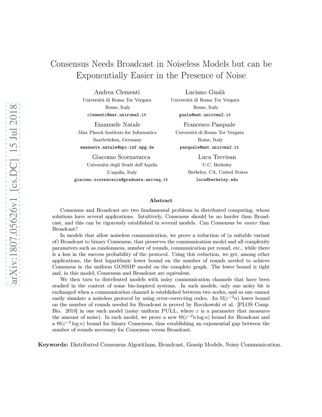 Consensus and Broadcast are two fundamental problems in distributed computing, whose solutions have several applications. Intuitively, Consensus should be no harder than Broadcast, and this can be rigorously established in several models. Can Consensus be easier than Broadcast? In models that allow noiseless communication, we prove a reduction of (a suitable variant of) Broadcast to binary Consensus, that preserves the communication model and all complexity parameters such as randomness, number of rounds, communication per round, etc., while there is a loss in the success probability of the protocol. Using this reduction, we get, among other applications, the first logarithmic lower bound on the number of rounds needed to achieve Consensus in the uniform GOSSIP model on the complete graph. The lower bound is tight and, in this model, Consensus and Broadcast are equivalent. We then turn to distributed models with noisy communication channels that have been studied in the context of some bio-inspired systems. In such models, only one noisy bit is exchanged when a communication channel is established between two nodes, and so one cannot easily simulate a noiseless protocol by using error-correcting codes. An lower bound on the number of rounds needed for Broadcast is proved by Boczkowski et al. [PLOS Comp. Bio. 2018] in one such model (noisy uniform PULL, where is a parameter that measures the amount of noise). In such model, we prove a new bound for Broadcast and a bound for binary Consensus, thus establishing an exponential gap between the number of rounds necessary for Consensus versus Broadcast.