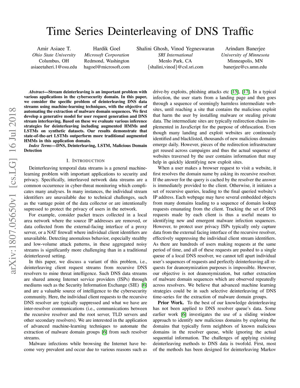 Stream deinterleaving is an important problem with various applications in the cybersecurity domain. In this paper, we consider the specific problem of deinterleaving DNS data streams using machine-learning techniques, with the objective of automating the extraction of malware domain sequences. We first develop a generative model for user request generation and DNS stream interleaving. Based on these we evaluate various inference strategies for deinterleaving including augmented HMMs and LSTMs on synthetic datasets. Our results demonstrate that state-of-the-art LSTMs outperform more traditional augmented HMMs in this application domain.