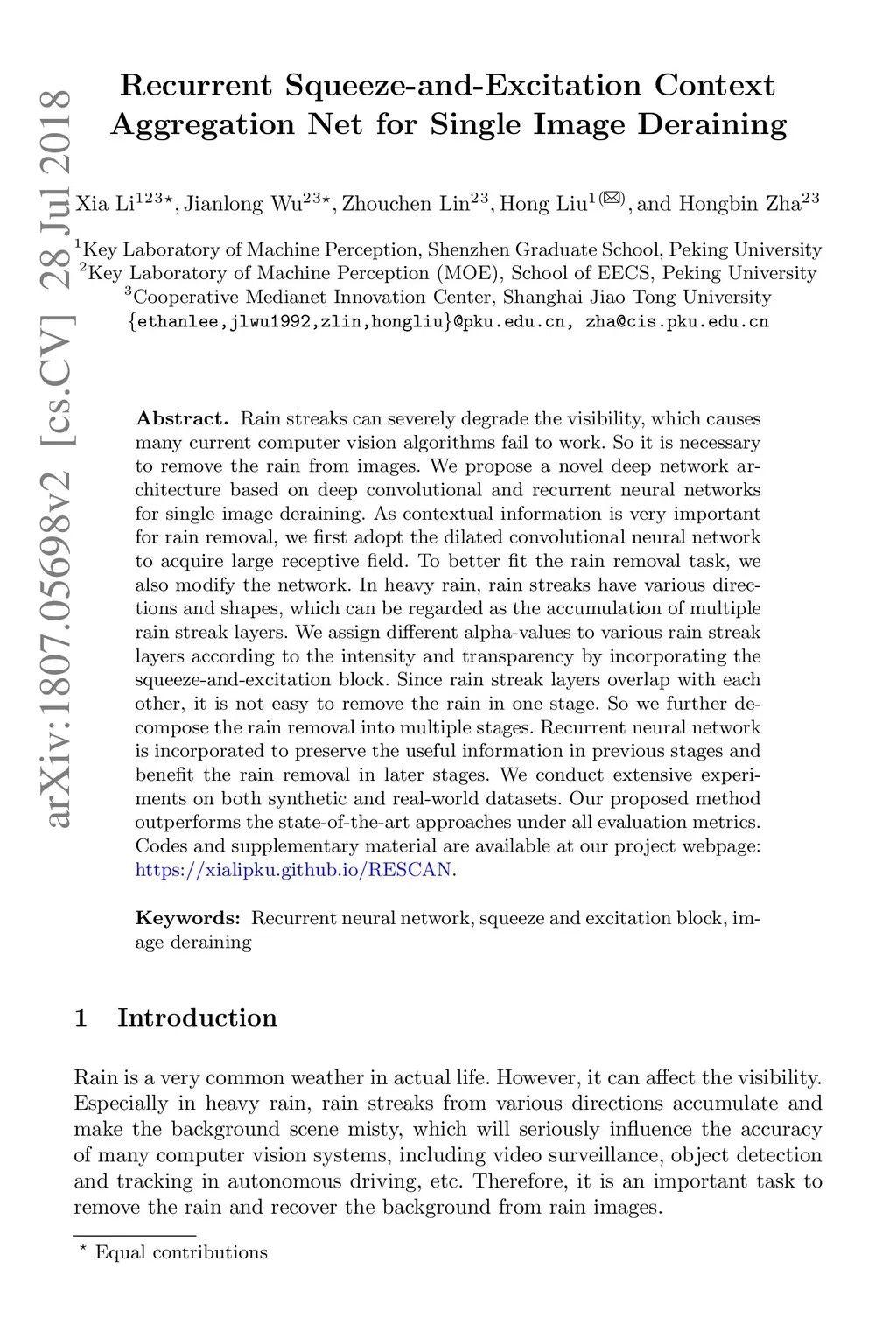 Recurrent Squeeze-and-Excitation Context Aggregation Net for Single Image Deraining