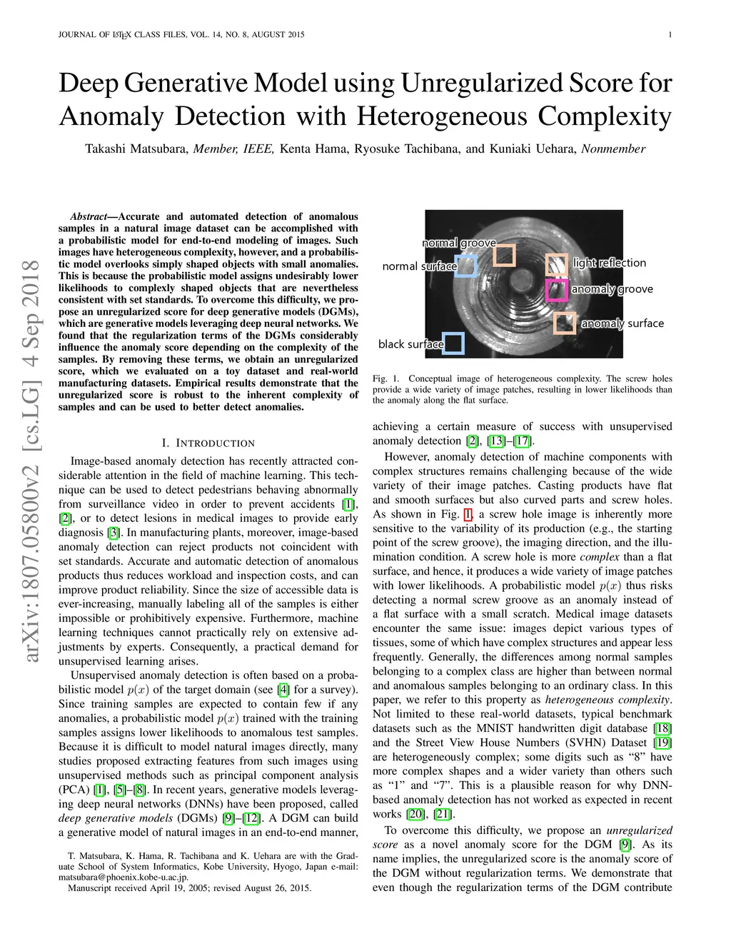 Accurate and automated detection of anomalous samples in a natural image dataset can be accomplished with a probabilistic model for end-to-end modeling of images. Such images have heterogeneous complexity, however, and a probabilistic model overlooks simply shaped objects with small anomalies. This is because the probabilistic model assigns undesirably lower likelihoods to complexly shaped objects that are nevertheless consistent with set standards. To overcome this difficulty, we propose an unregularized score for deep generative models (DGMs), which are generative models leveraging deep neural networks. We found that the regularization terms of the DGMs considerably influence the anomaly score depending on the complexity of the samples. By removing these terms, we obtain an unregularized score, which we evaluated on a toy dataset and real-world manufacturing datasets. Empirical results demonstrate that the unregularized score is robust to the inherent complexity of samples and can be used to better detect anomalies.