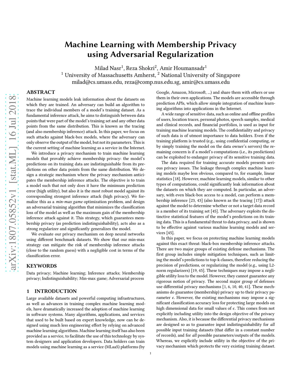 Machine learning models leak information about the datasets on which they are trained. An adversary can build an algorithm to trace the individual members of a model's training dataset. As a fundamental inference attack, he aims to distinguish between data points that were part of the model's training set and any other data points from the same distribution. This is known as the tracing (and also membership inference) attack. In this paper, we focus on such attacks against black-box models, where the adversary can only observe the output of the model, but not its parameters. This is the current setting of machine learning as a service in the Internet. We introduce a privacy mechanism to train machine learning models that provably achieve membership privacy: the model's predictions on its training data are indistinguishable from its predictions on other data points from the same distribution. We design a strategic mechanism where the privacy mechanism anticipates the membership inference attacks. The objective is to train a model such that not only does it have the minimum prediction error (high utility), but also it is the most robust model against its corresponding strongest inference attack (high privacy). We formalize this as a min-max game optimization problem, and design an adversarial training algorithm that minimizes the classification loss of the model as well as the maximum gain of the membership inference attack against it. This strategy, which guarantees membership privacy (as prediction indistinguishability), acts also as a strong regularizer and significantly generalizes the model. We evaluate our privacy mechanism on deep neural networks using different benchmark datasets. We show that our min-max strategy can mitigate the risk of membership inference attacks (close to the random guess) with a negligible cost in terms of the classification error.