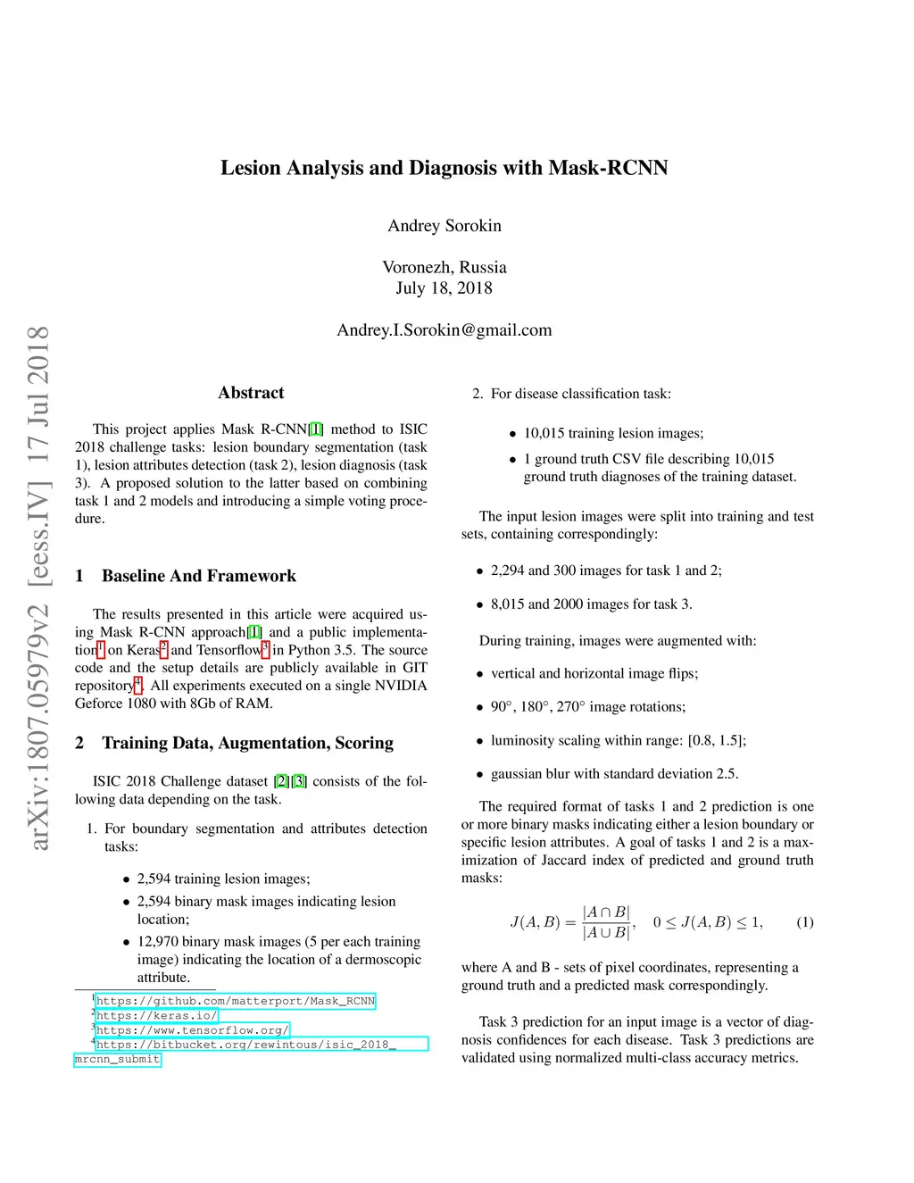 This project applies Mask R-CNN method to ISIC 2018 challenge tasks: lesion boundary segmentation (task1), lesion attributes detection (task 2), lesion diagnosis (task 3), a solution to the latter is using a trained model for task 1 and a simple voting procedure.