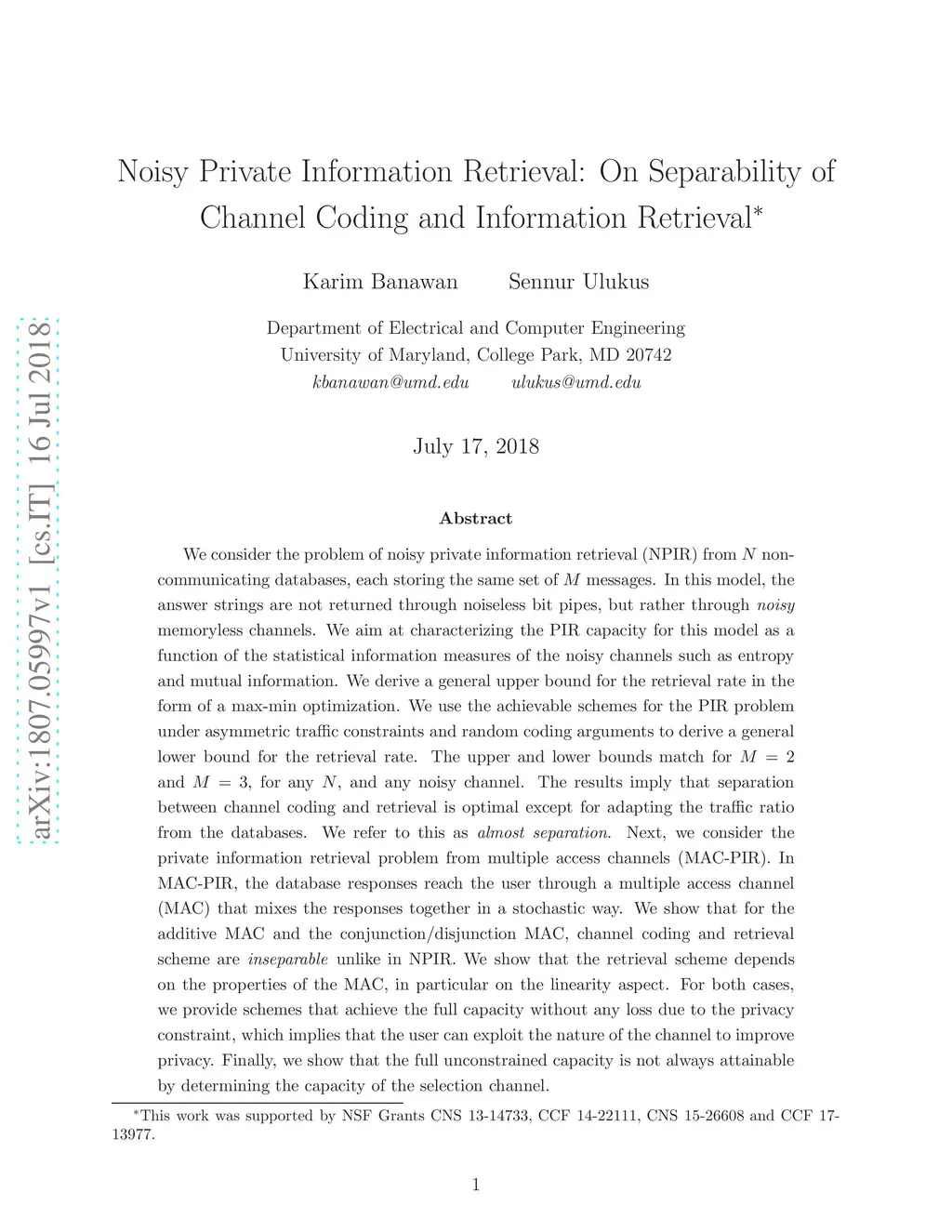 Noisy Private Information Retrieval: On Separability of Channel Coding
