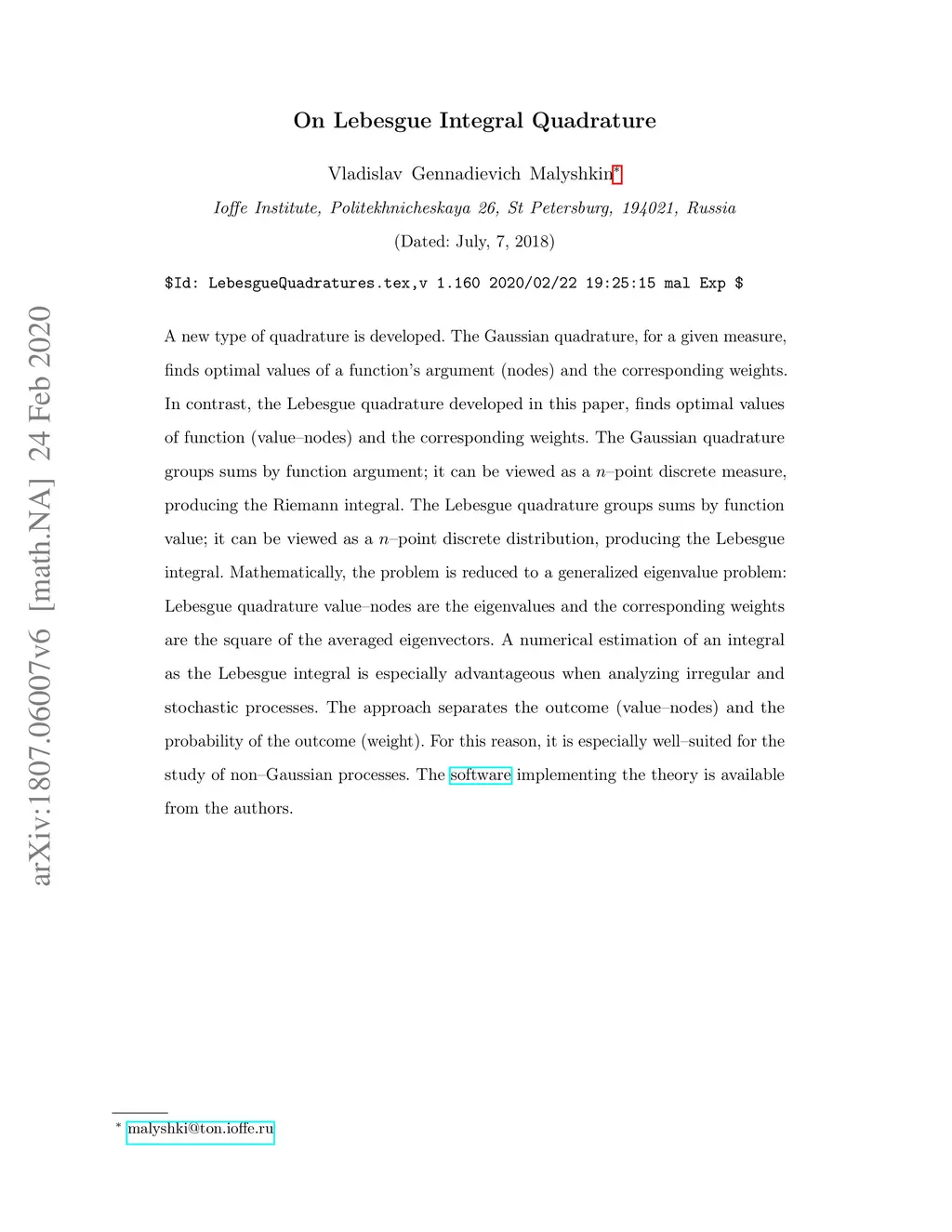 A new type of quadrature is developed. The Gaussian quadrature, for a given measure, finds optimal values of a function's argument (nodes) and the corresponding weights. In contrast, the Lebesgue quadrature developed in this paper, finds optimal values of function (value-nodes) and the corresponding weights. The Gaussian quadrature groups sums by function argument; it can be viewed as a -point discrete measure, producing the Riemann integral. The Lebesgue quadrature groups sums by function value; it can be viewed as a -point discrete distribution, producing the Lebesgue integral. Mathematically, the problem is reduced to a generalized eigenvalue problem: Lebesgue quadrature value-nodes are the eigenvalues and the corresponding weights are the square of the averaged eigenvectors. A numerical estimation of an integral as the Lebesgue integral is especially advantageous when analyzing irregular and stochastic processes. The approach separates the outcome (value-nodes) and the probability of the outcome (weight). For this reason, it is especially well-suited for the study of non-Gaussian processes. The software implementing the theory is available from the authors.