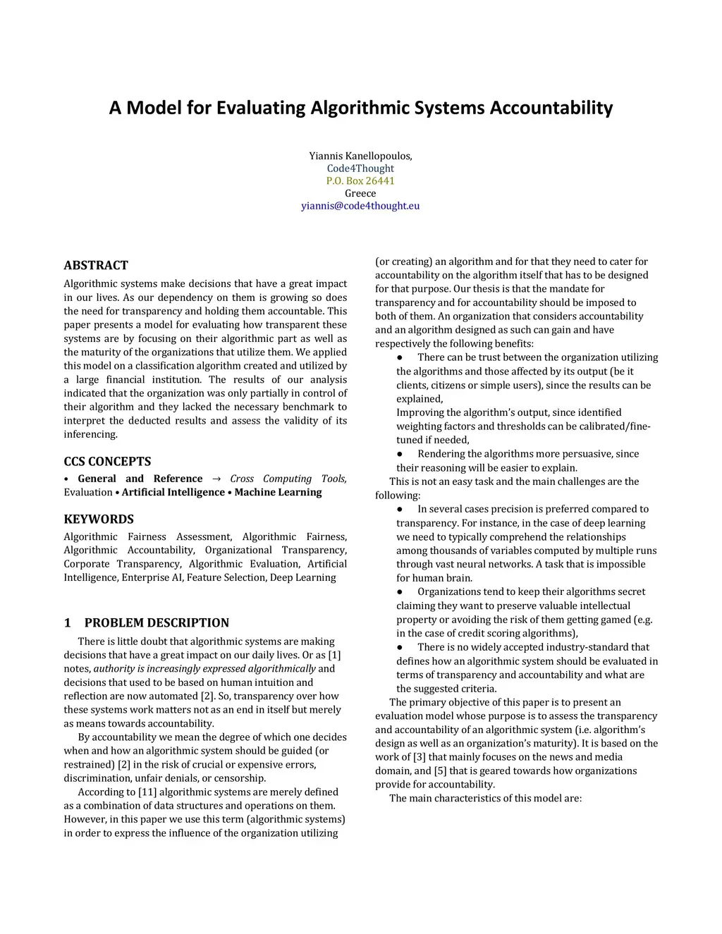 Algorithmic systems make decisions that have a great impact in our lives. As our dependency on them is growing so does the need for transparency and holding them accountable. This paper presents a model for evaluating how transparent these systems are by focusing on their algorithmic part as well as the maturity of the organizations that utilize them. We applied this model on a classification algorithm created and utilized by a large financial institution. The results of our analysis indicated that the organization was only partially in control of their algorithm and they lacked the necessary benchmark to interpret the deducted results and assess the validity of its inferencing.
